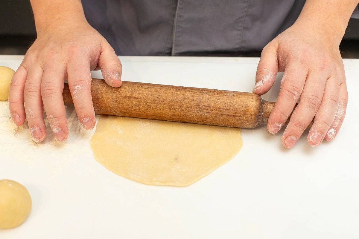 Припылите рабочую поверхность мукой и раскатайте каждый шарик в тонкую лепёшку толщиной примерно 2 мм.