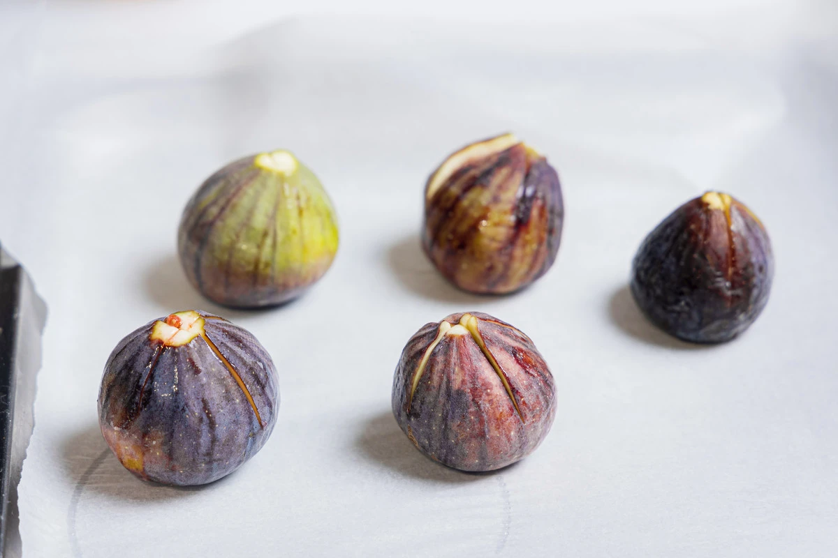 Застелите противень бумагой для выпечки и выложите на неё инжир. Запекайте в течение 10 минут при 180 °C.