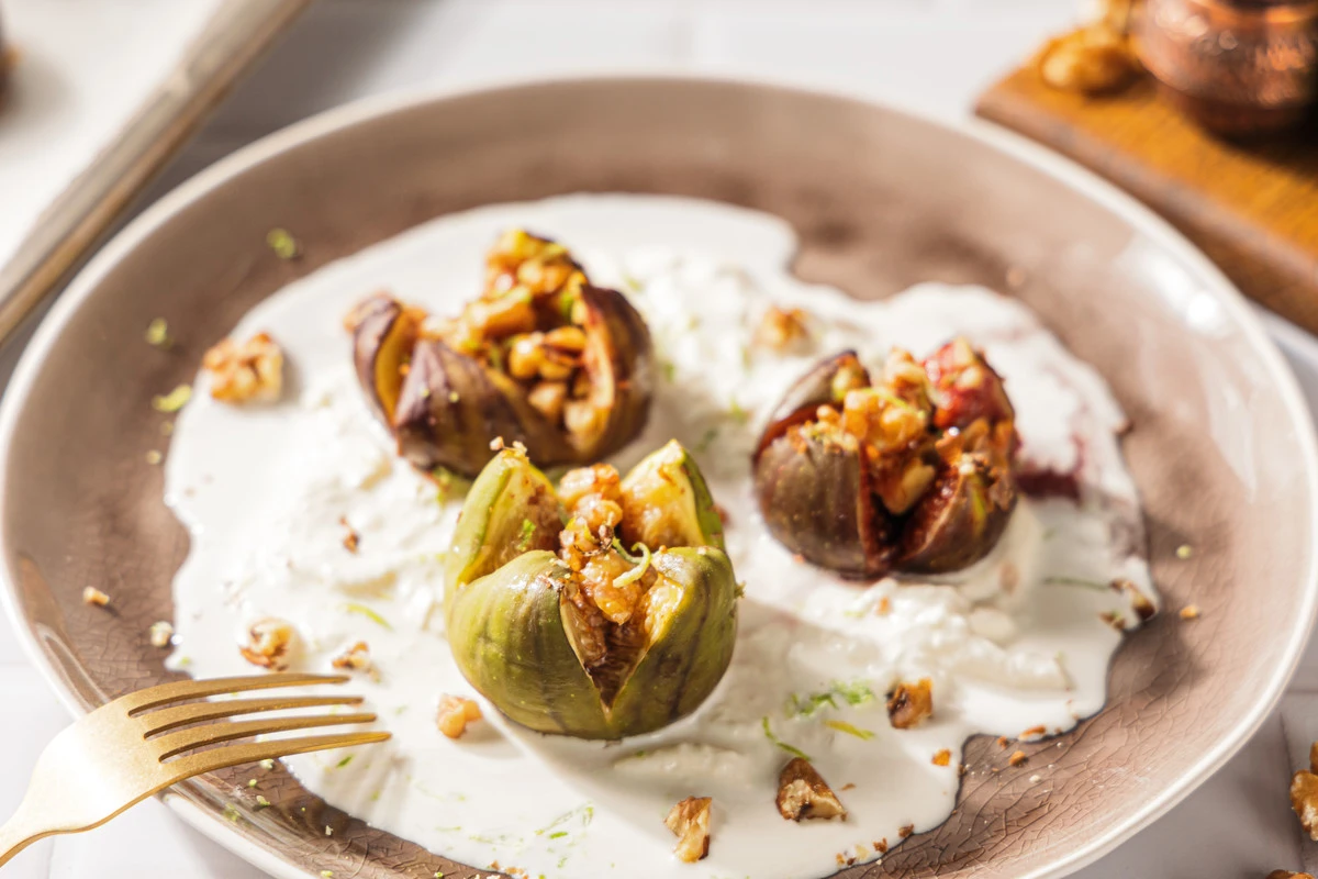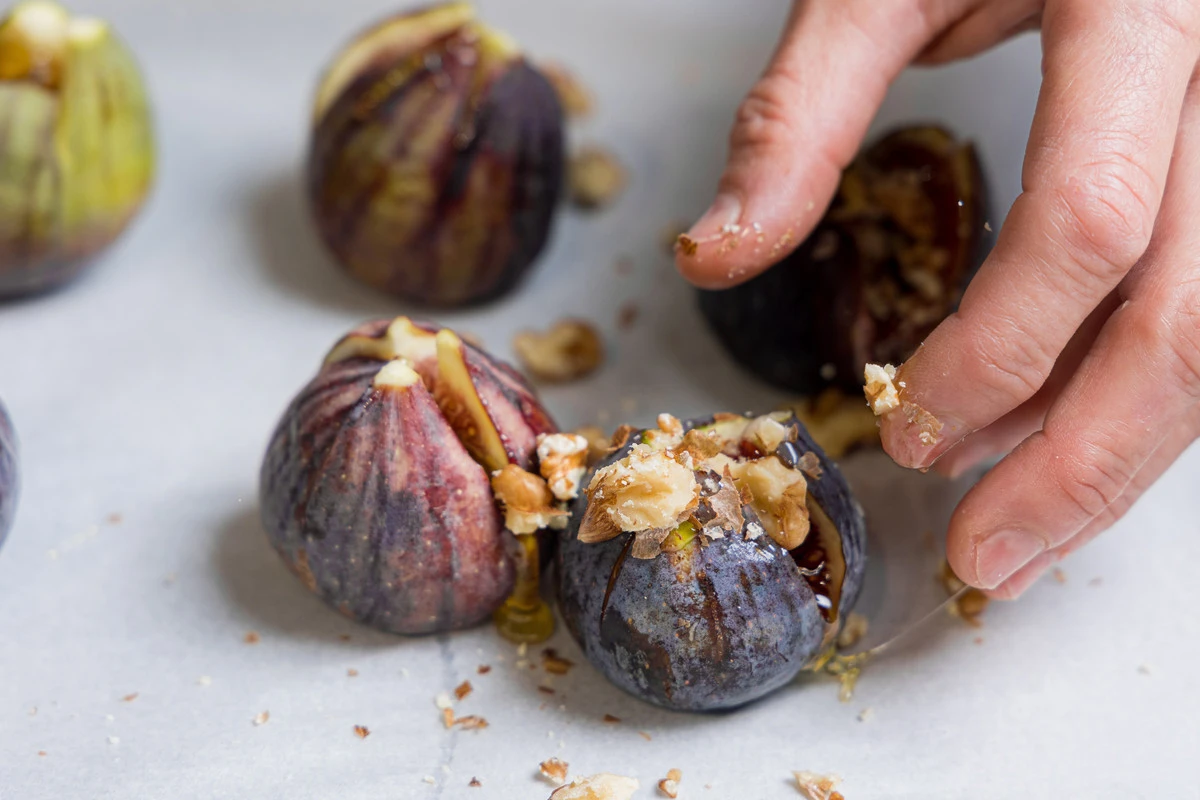 Налейте в каждый плод немного мёда. Грецкие орехи поломайте, посыпьте ими инжир.