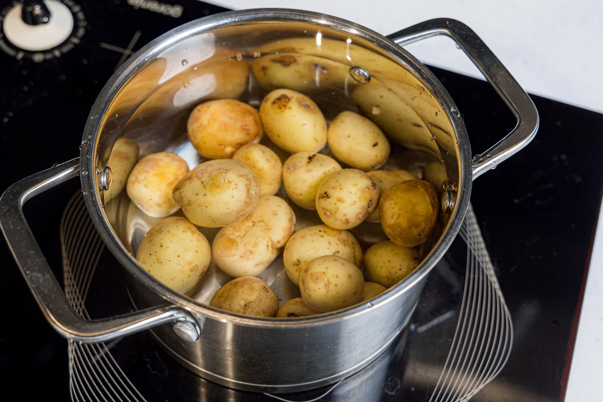 Картофель помойте и отварите в течение примерно 15 минут. Готовность проверьте ножом — лезвие должно легко выходить из картошки. Разрежьте картофель на две половинки, выложите в форму для запекания.