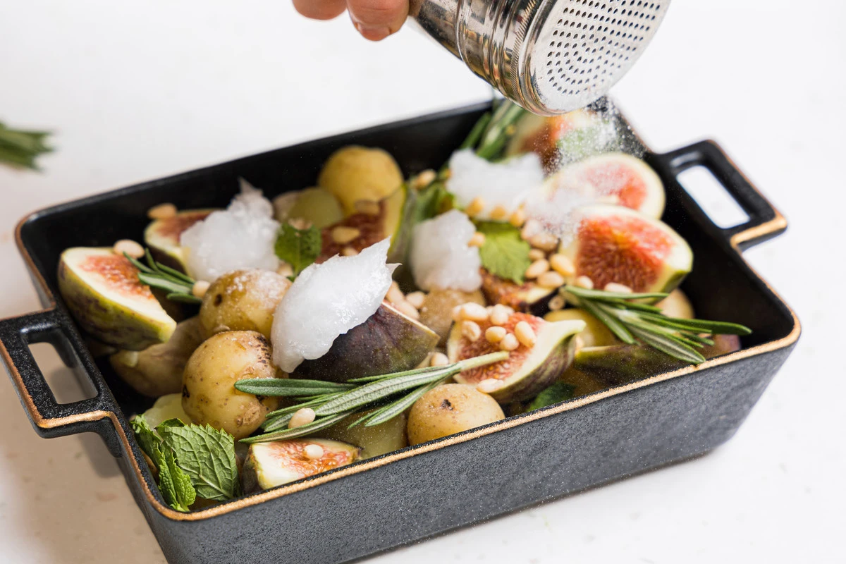 Инжир помойте, разрежьте на четвертинки, выложите на картофель. Добавьте листочки розмарина и мяты. Посыпьте кедровыми орешками.