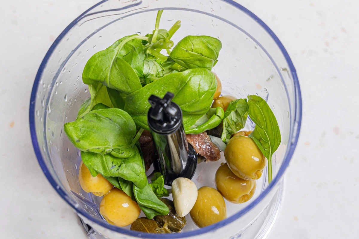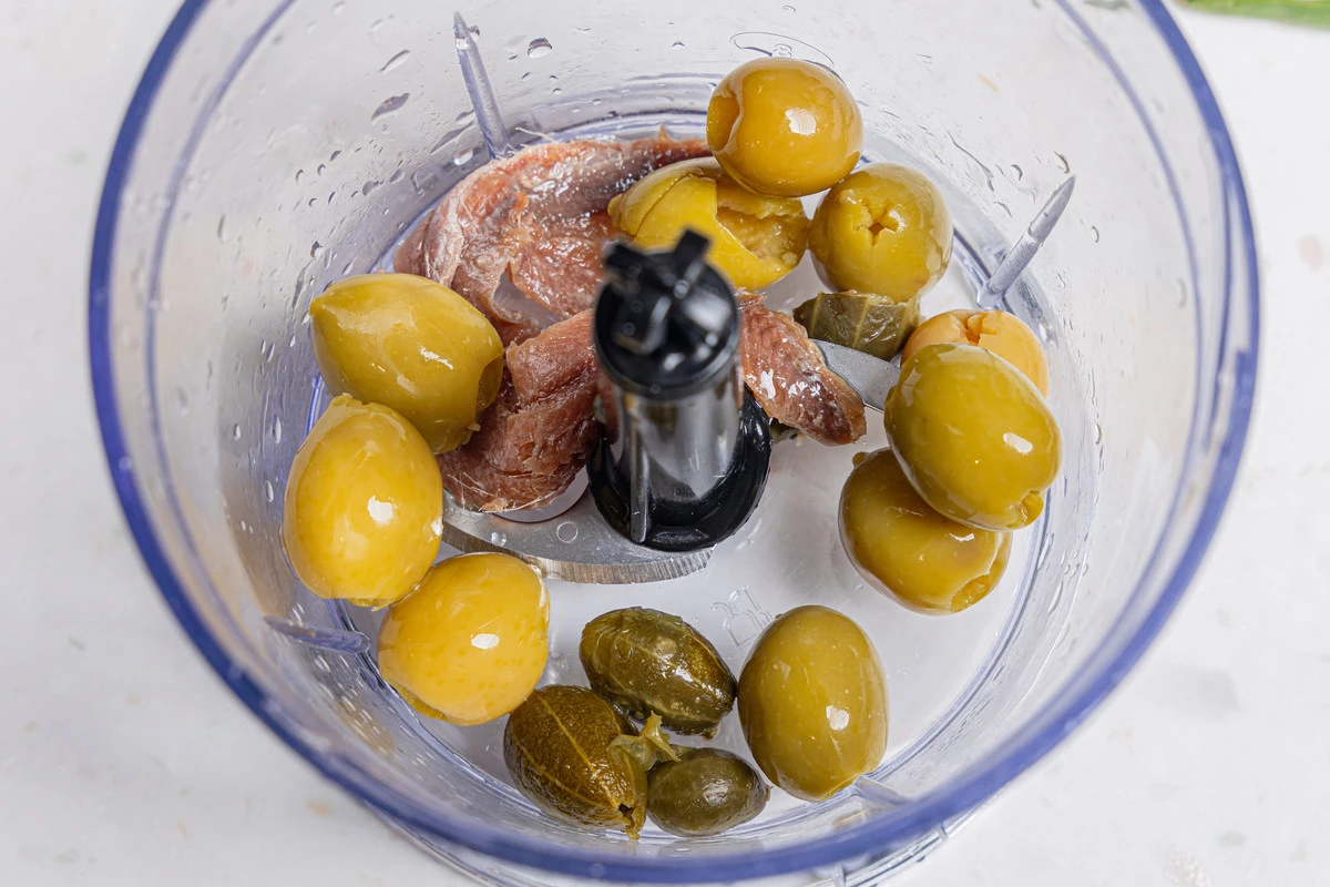 Сложите в чашу блендера оливки, каперсы и ансоусы.