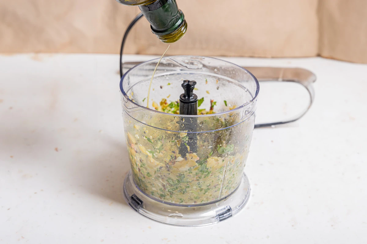 Измельчите всё вместе блендером. Добавьте оливковое масло.