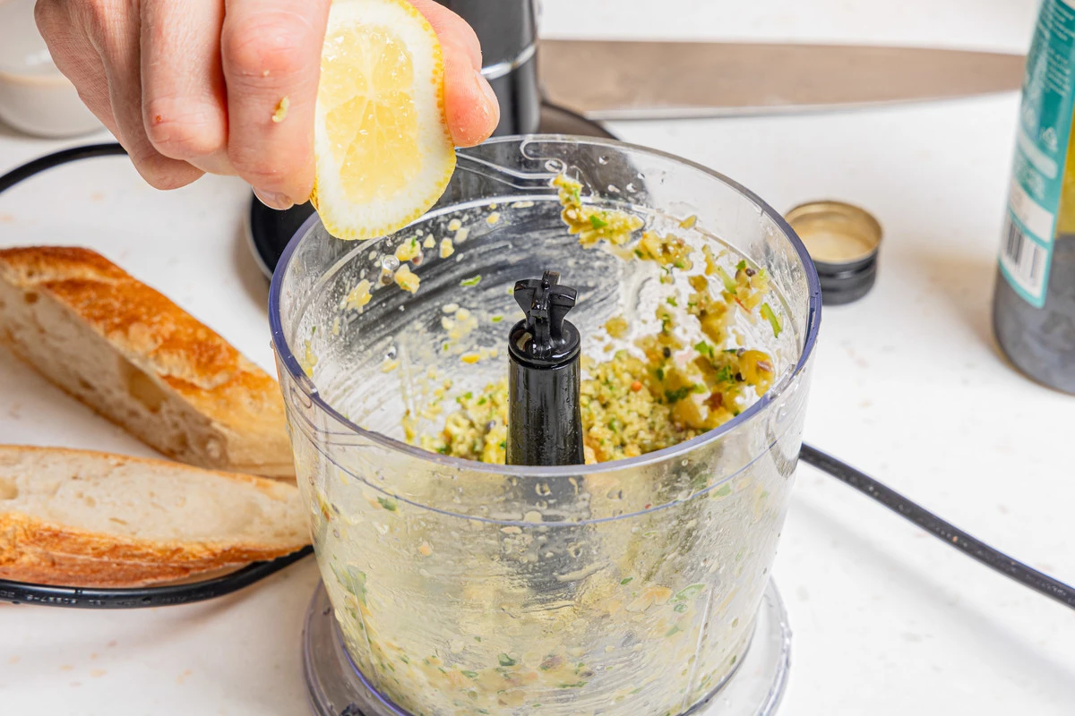 Добавьте лимонный сок и ещё раз измельчите всё блендером. Подавайте с подсушенными ломтиками багета.