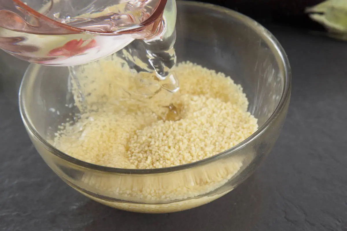 Кус-кус залейте кипятком и оставьте набухать под крышкой.