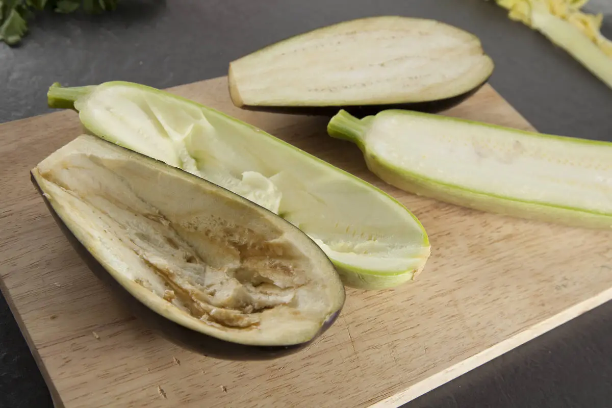 Кабачок и баклажан разрежьте пополам, маленьким ножом аккуратно вырежьте мякоть из середины, чтобы получились лодочки. Баклажаны запеките в духовке (примерно 15 минут), накрыв листом фольги.