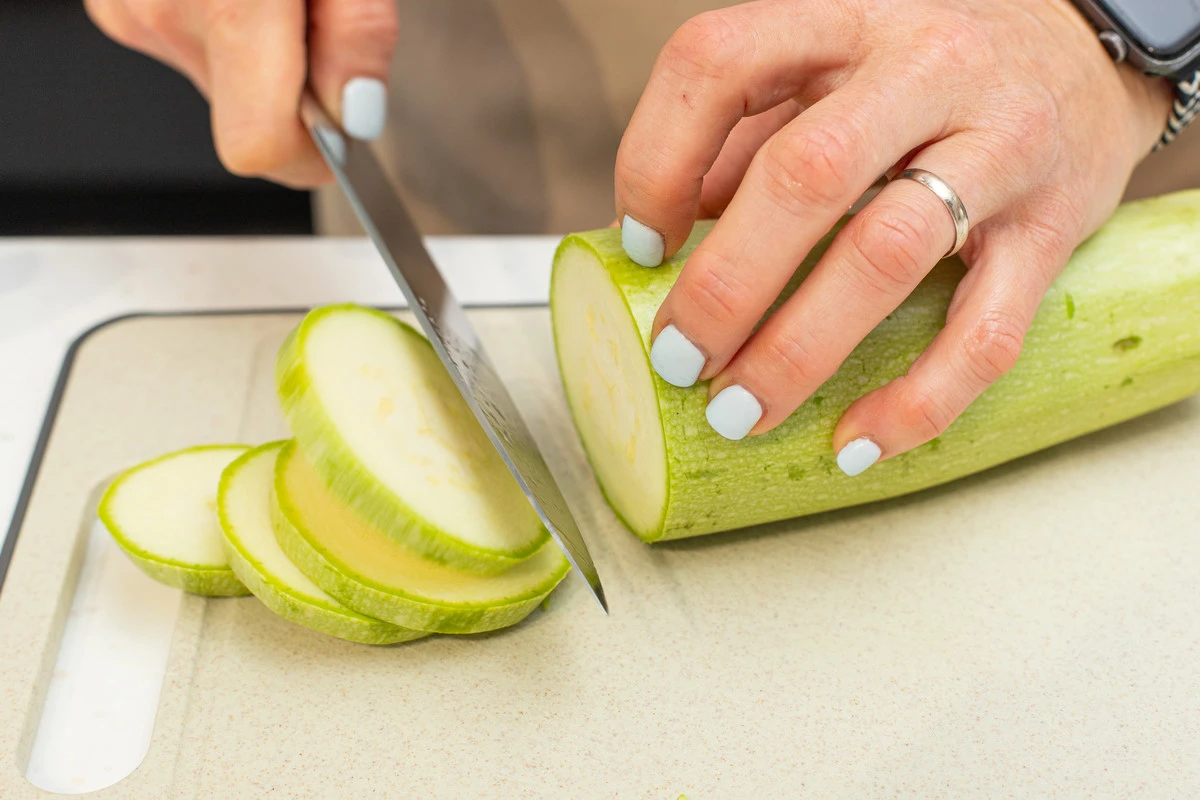 Помойте кабачок, отрежьте плодоножки. Нарежьте кружочками толщиной 0,5-1 см.