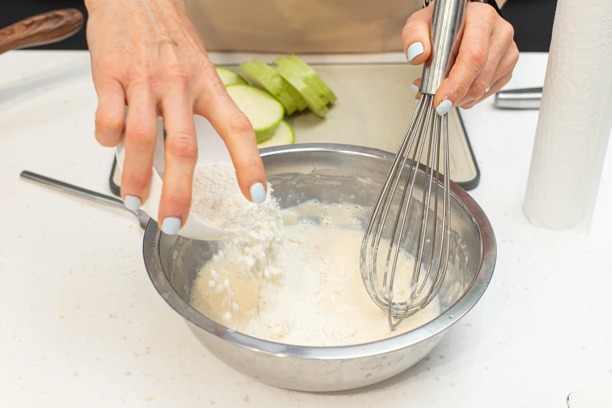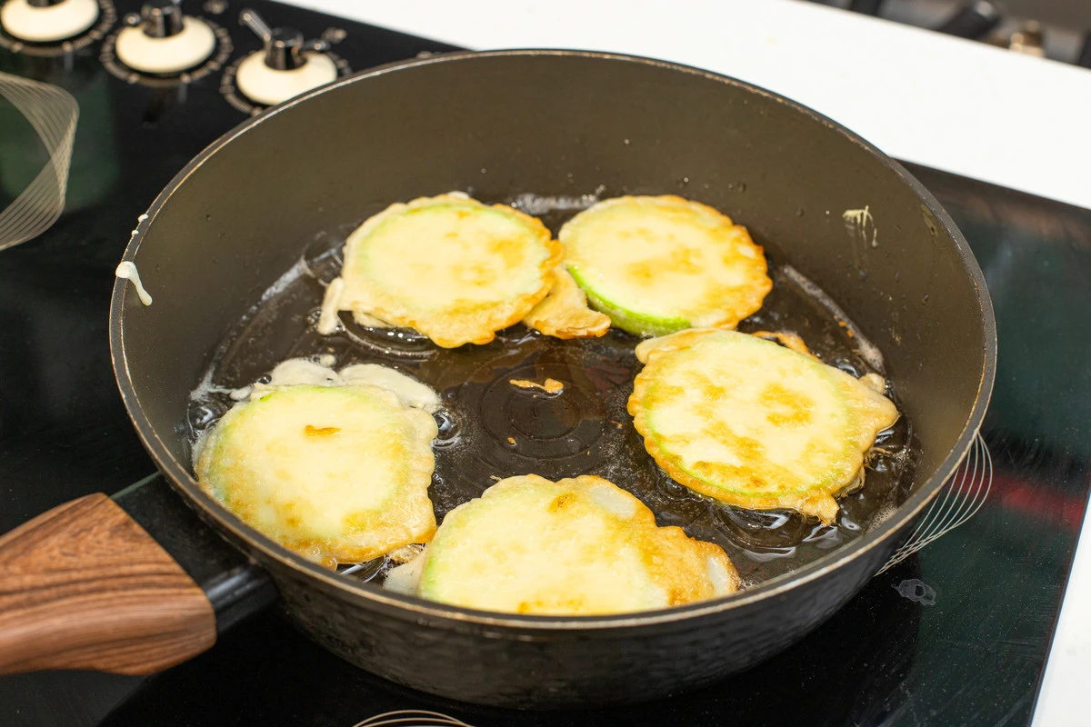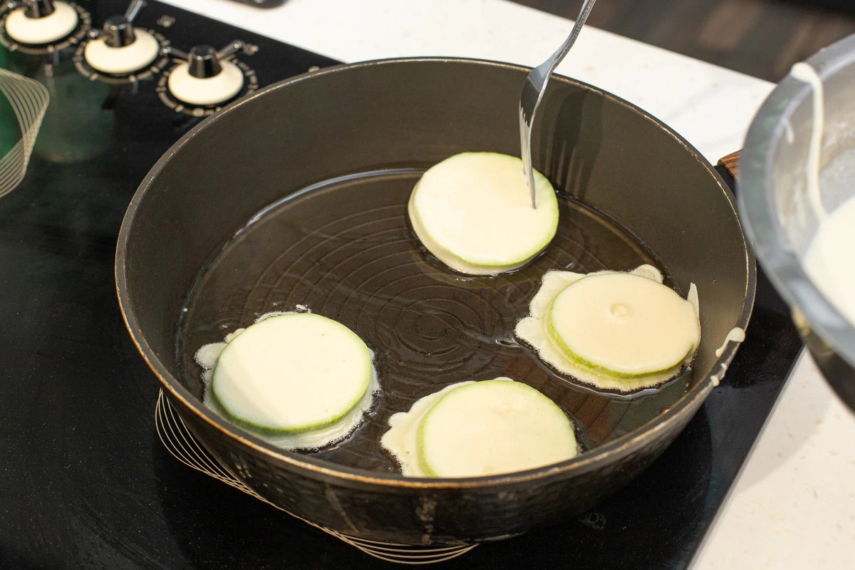 Разогрейте сковороду с двумя-тремя ложками масла. Подцепите вилкой кружок кабачка, окуните в тесто так, чтобы полностью покрыть кляром со всех сторон, и выложите на сковороду. Повторите с остальными кружочками.