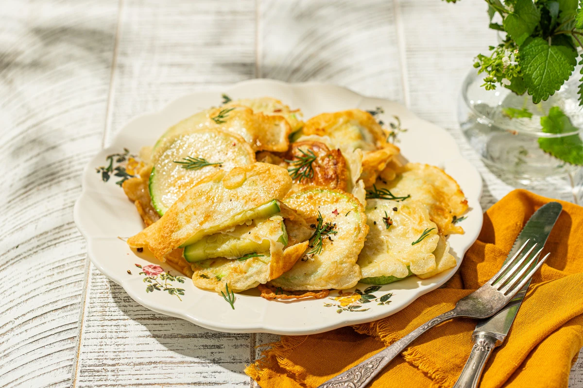 Жарьте кабачки в кляре по 2-3 минуты с каждой стороны на среднем огне, а затем выложите на бумажную салфетку, чтобы стёк лишний жир. При обжаривании в течение 2-3 минут с каждой стороны вы получите слегка хрустящие кабачки (al dente). Если вы любите более мягкие овощи, можно обжаривать подольше. Только следите, чтобы кабачки не подгорали.