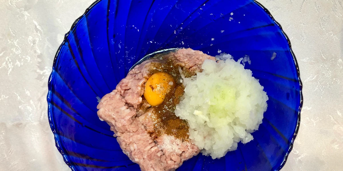 Смешать фарш с яйцом и натёртым на тёрке луком, добавить перец, соль и другие специи по вкусу.