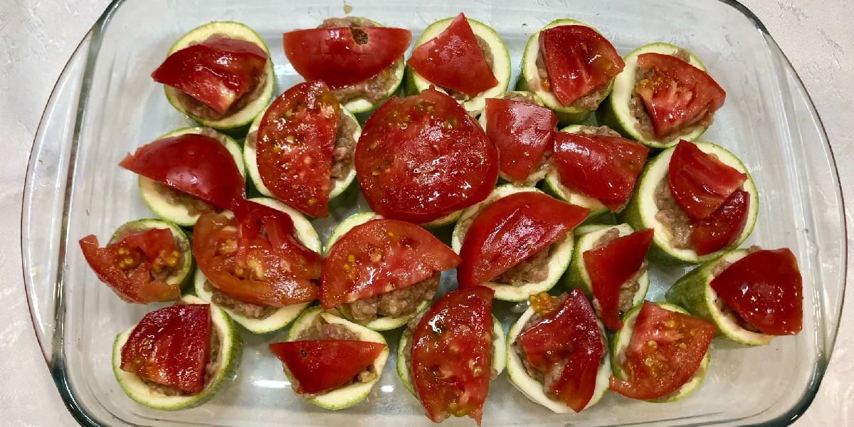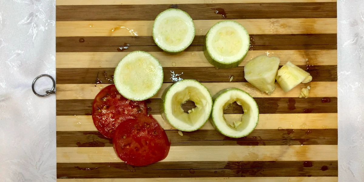Нарезать кабачок на крупные кольца, cтаканом или ложкой достать мякоть. Если семечки внутри нежные и мягкие, их можно смешать с мясным фаршем, зрелые лучше удалить. Нарезать помидоры кружочками.