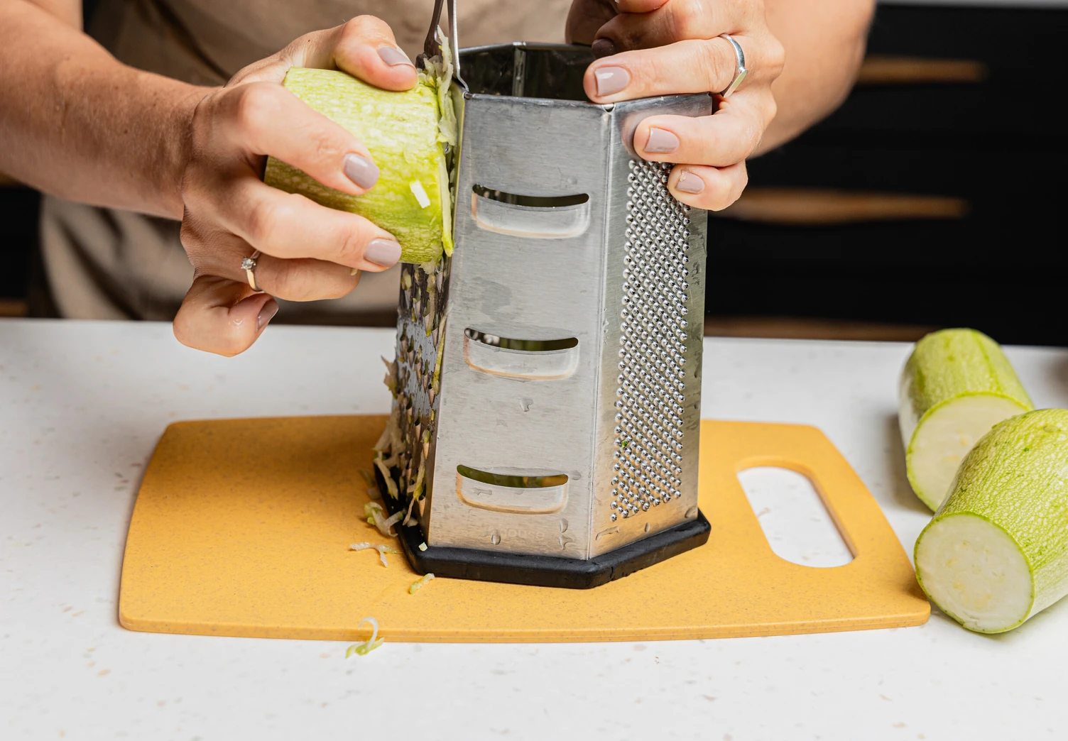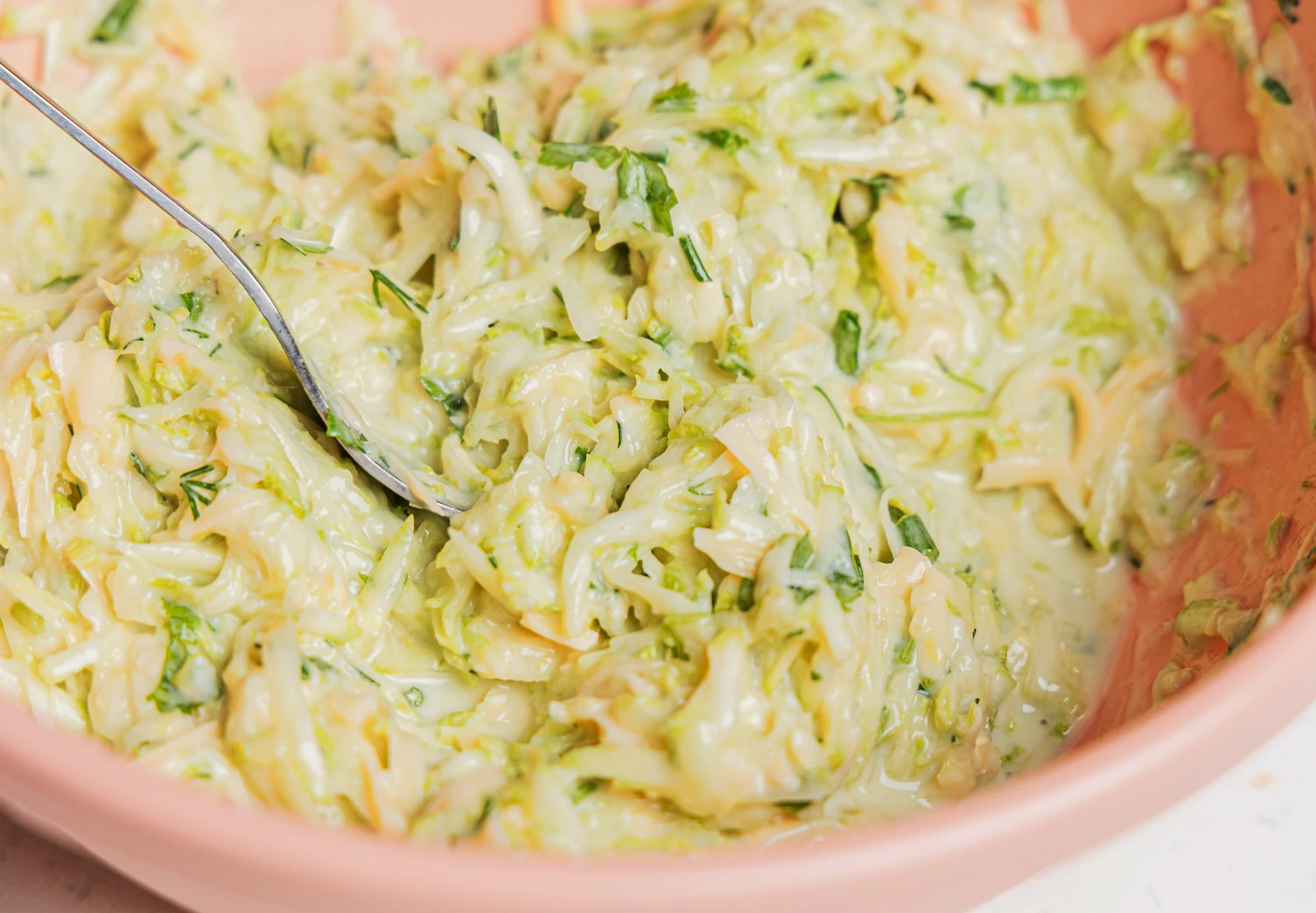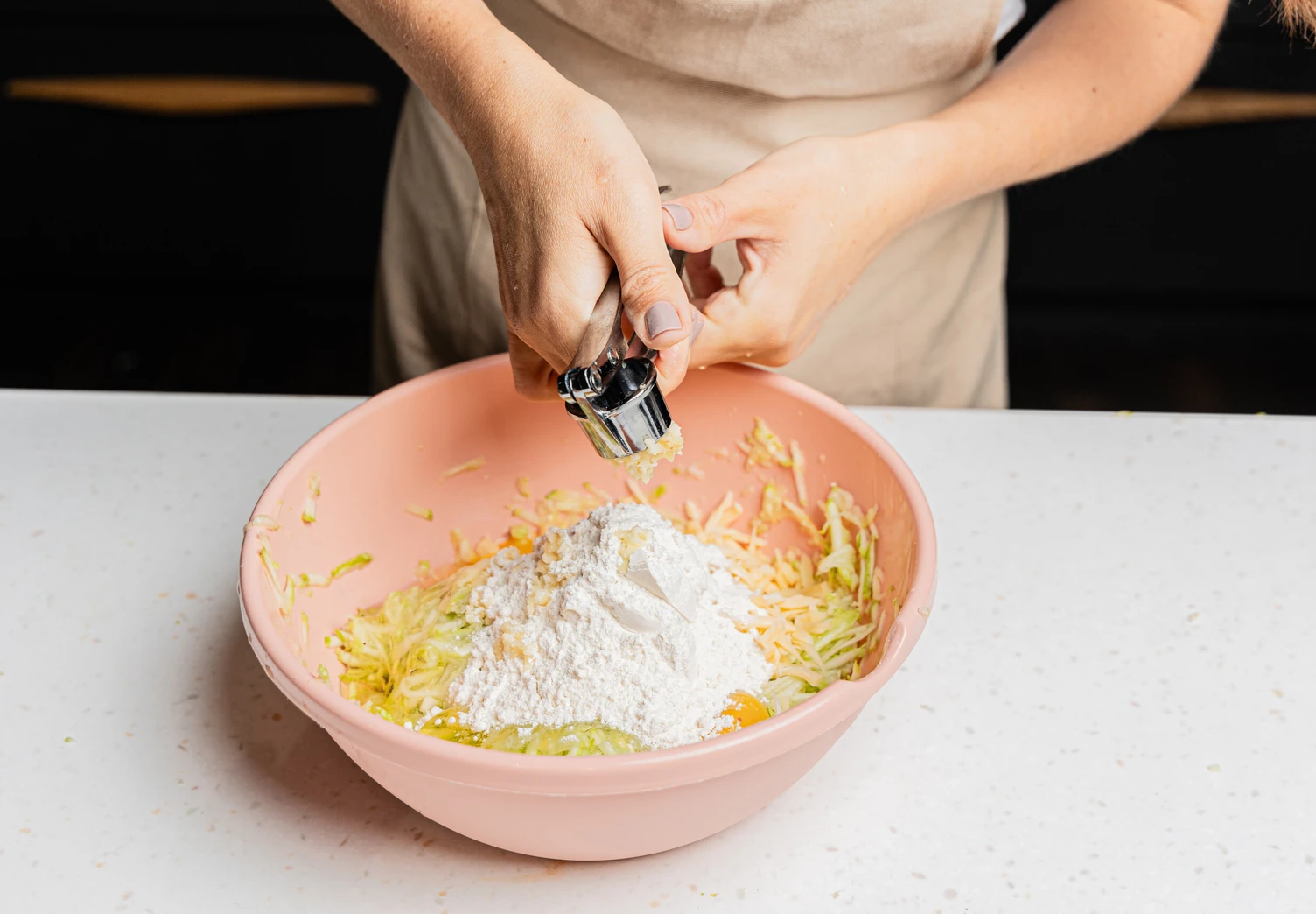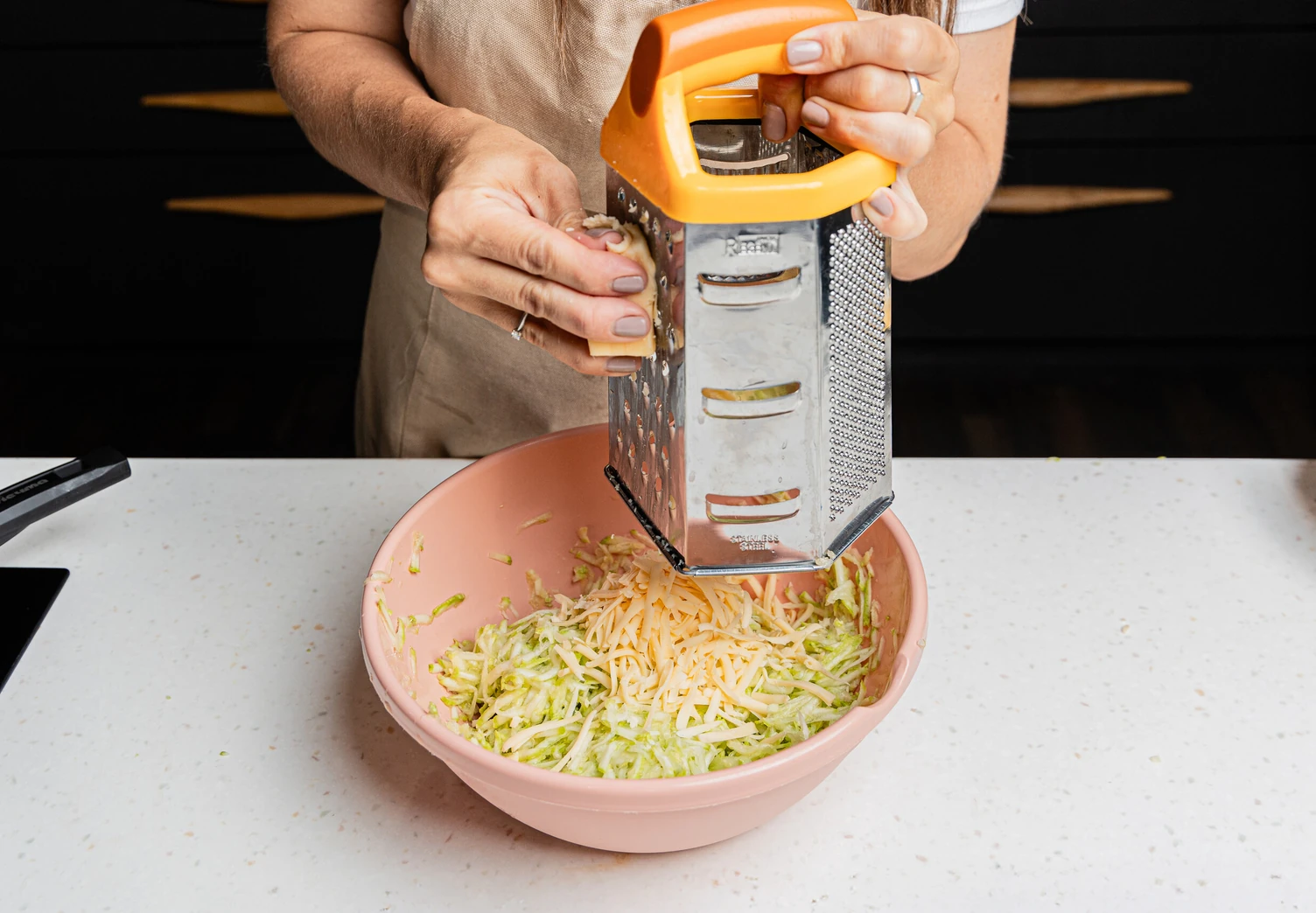 Кабачки натрите на средней тёрке, выложите в отдельную миску и оставьте на 15–20 минут. За это время овощ пустит сок — отожмите мякоть, а лишнюю жидкость слейте.