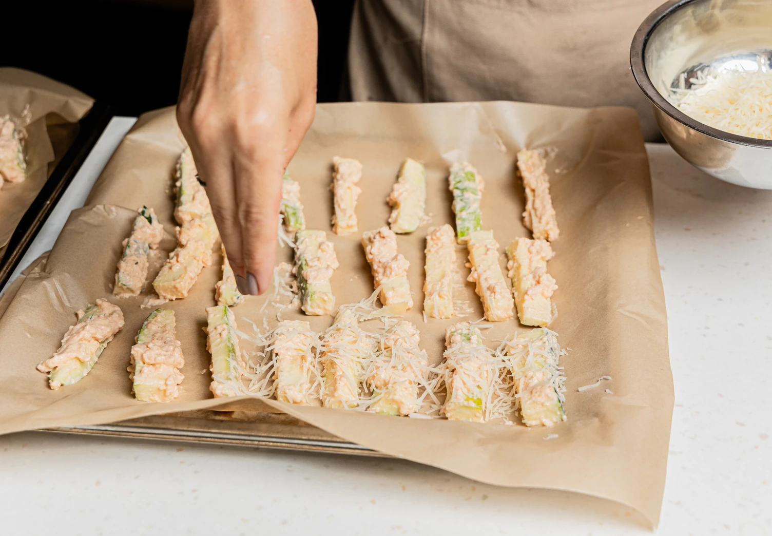 Выложите их на противень, застеленный пергаментом, и посыпьте тёртым пармезаном. Запеките в духовке при 200 градусах в течение 15–20 минут.