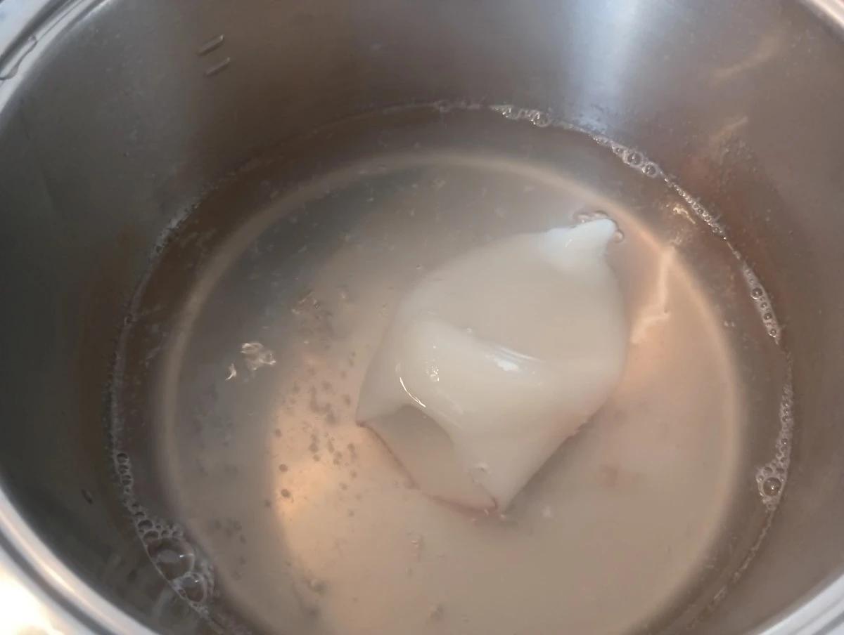 Кальмары предварительно разморозьте. Ополосните под водой, удалите хорду, внутренности и снимите плёнку. Отварите в подсоленной воде в течение 30 секунд.