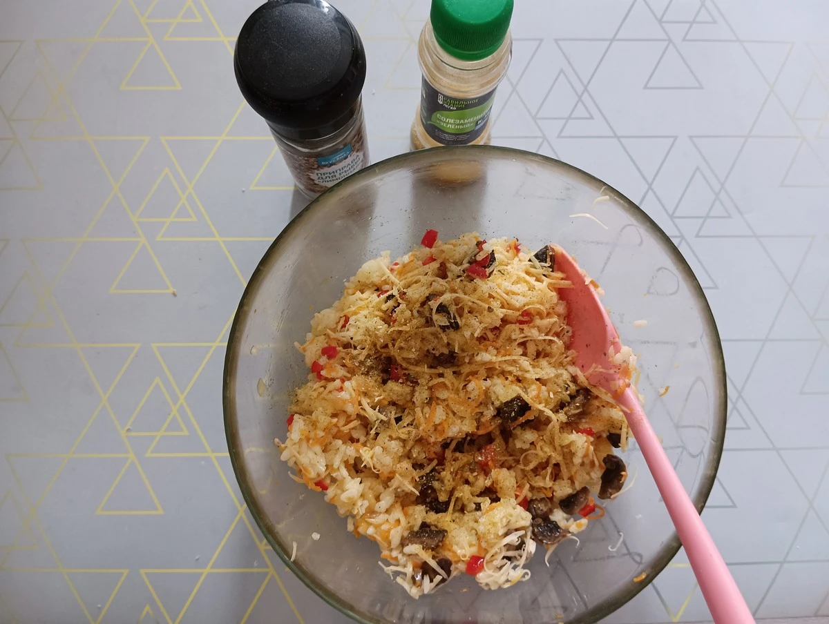 Соедините рис, овощи, грибы и сыр, посолите, поперчите по вкусу, перемешайте.