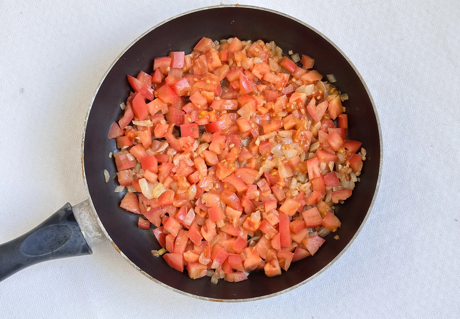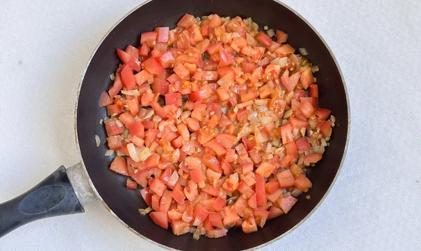 Для начинки измельчите чеснок, лук нарежьте на средние кубики и обжарьте их на масле 2-3 минуты. Нарежьте помидоры на небольшие кубики и добавьте к луку. Добавьте соль и специи. Жарьте ещё 3–4 минуты.