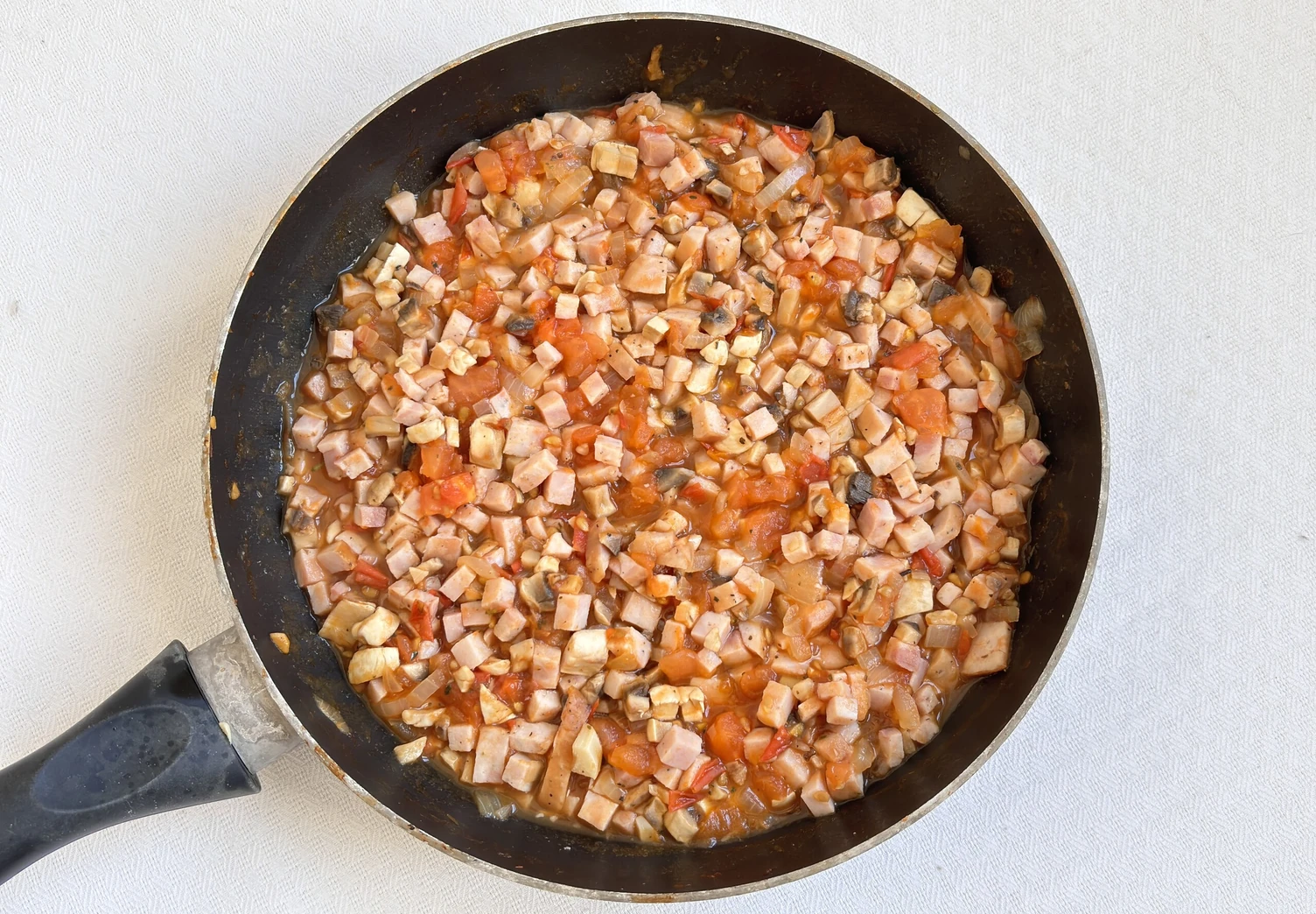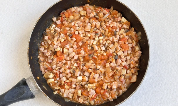 Грибы и ветчину нарежьте на небольшие кубики. Добавьте к начинке и жарьте ещё 3–4 минуты.
