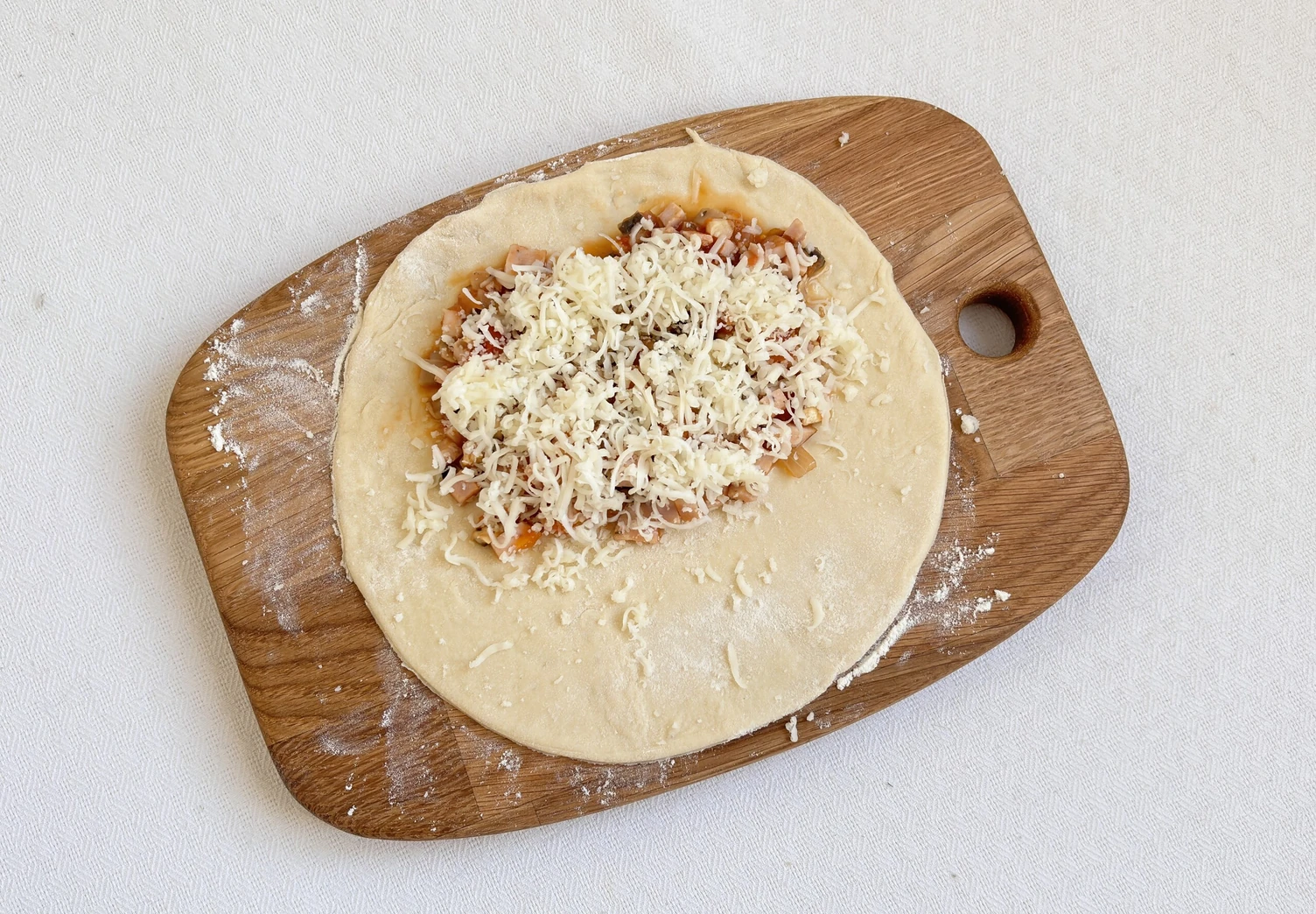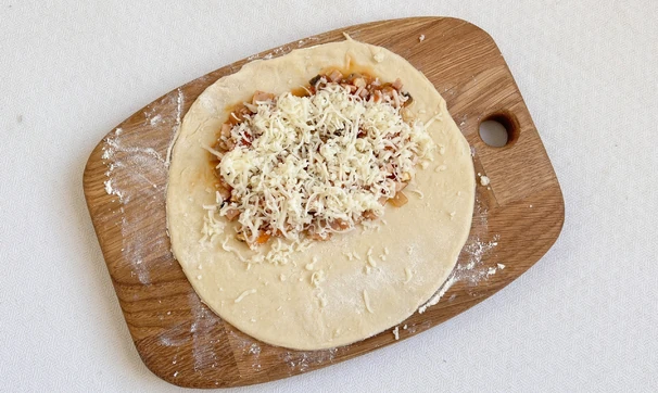 Тесто разделите на 7 частей. Возьмите одну из частей, раскатайте в круг, выложите начинку и натёртый сыр обоих видов.