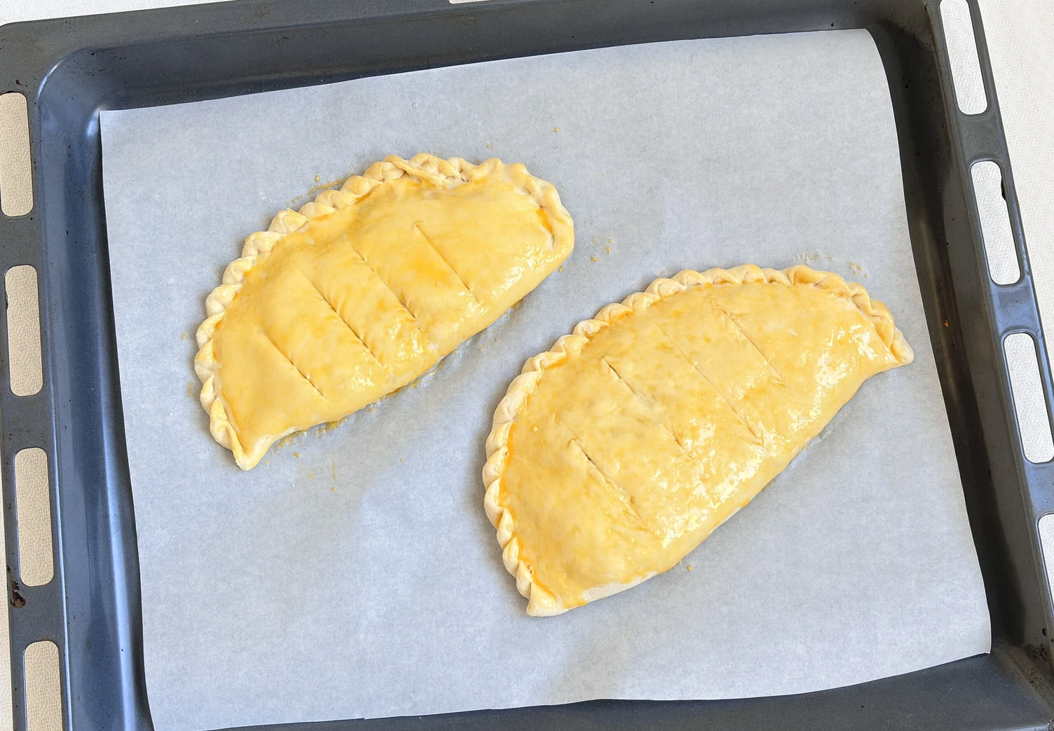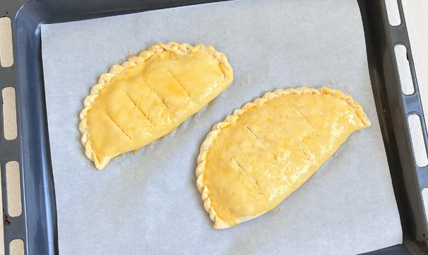 Сделайте в кальцоне небольшие надрезы, смажьте желтком и отправьте в духовку, разогретую до 220°C, на 7–8 минут до образования золотистой корочки.