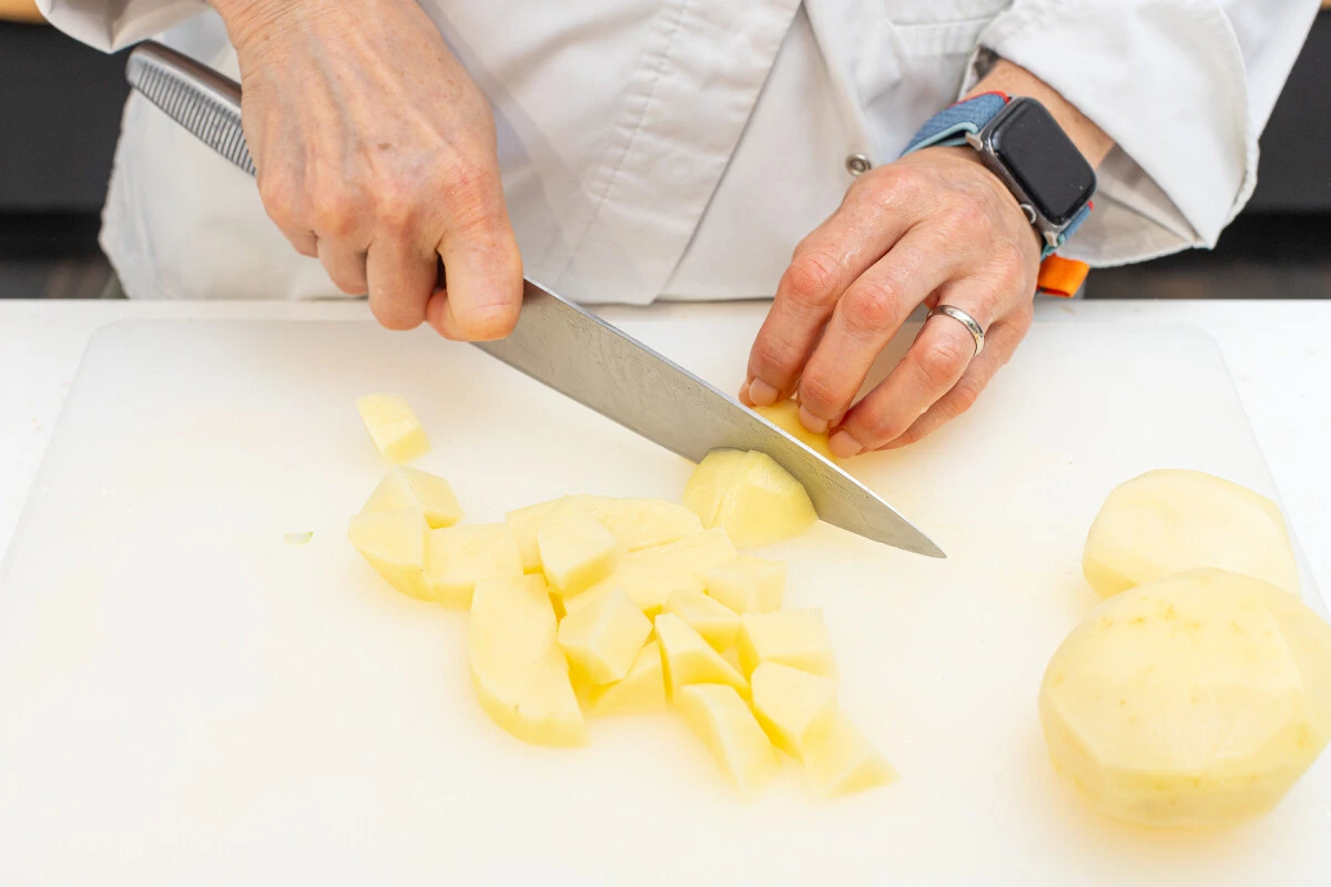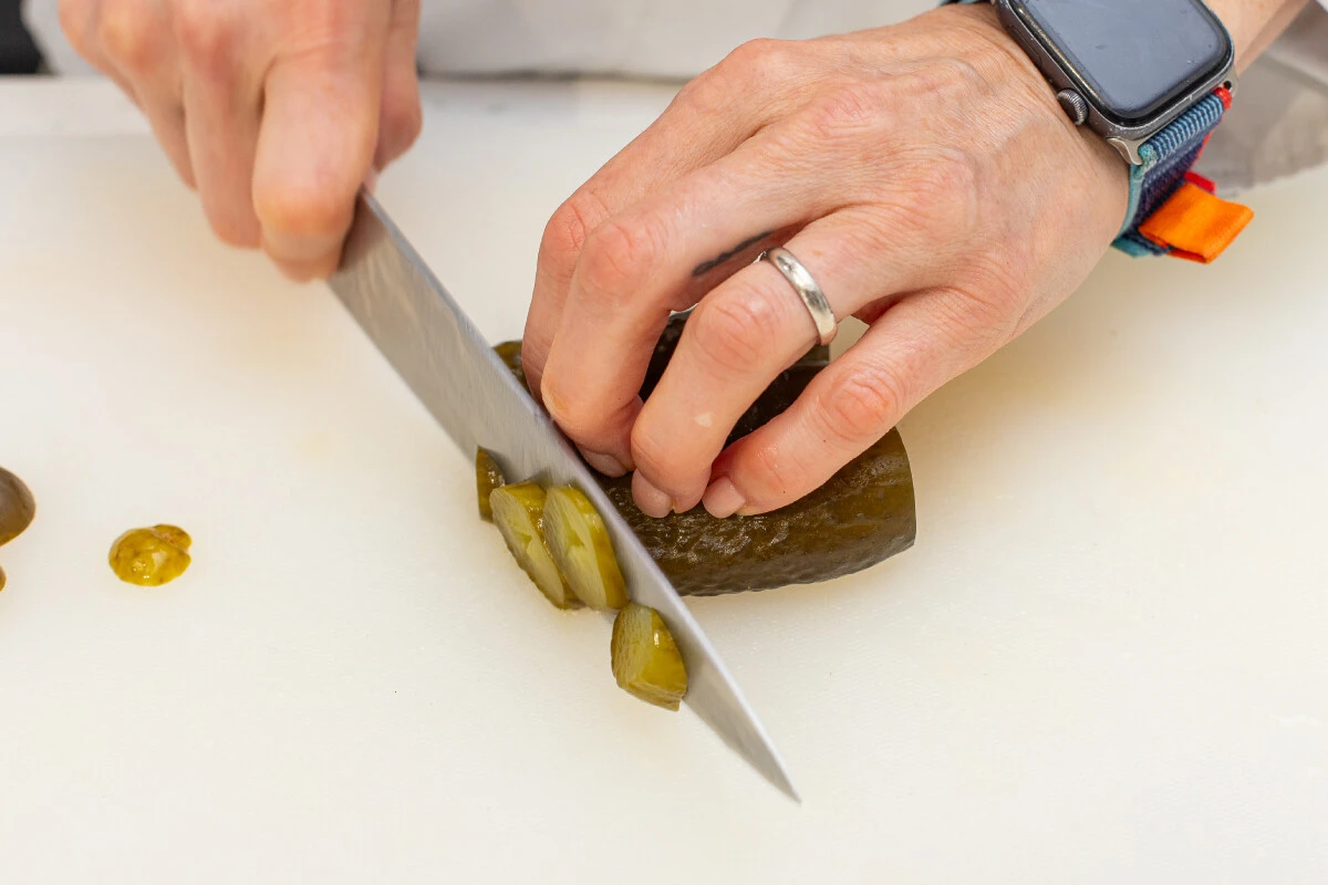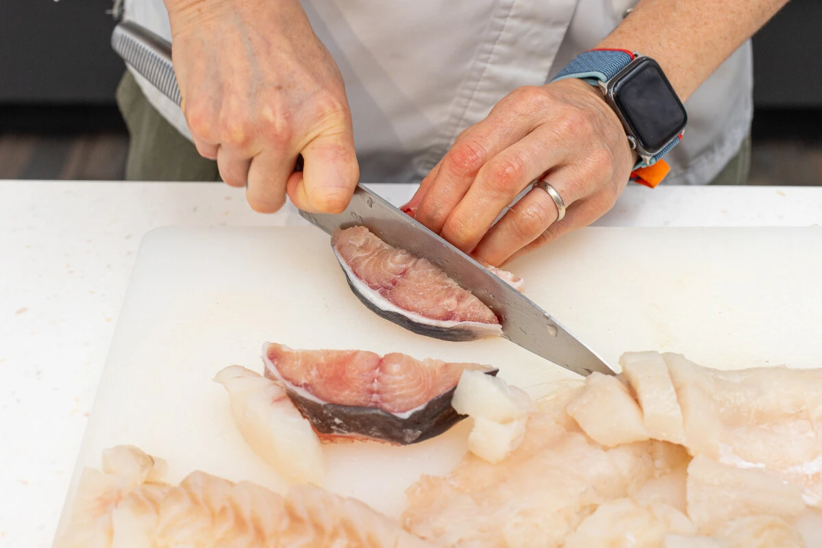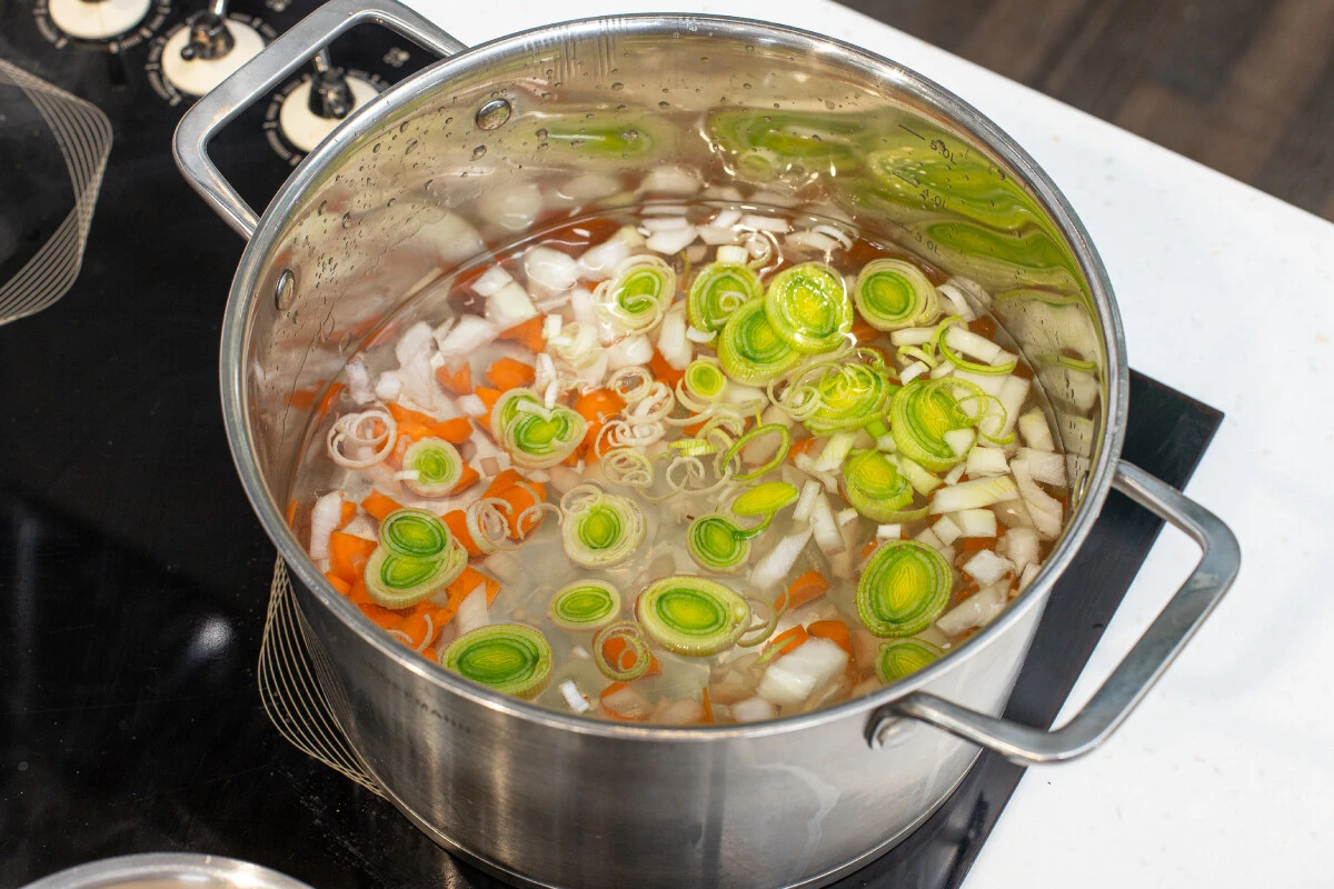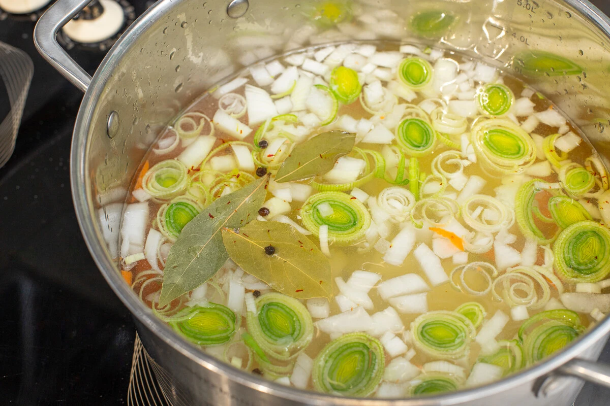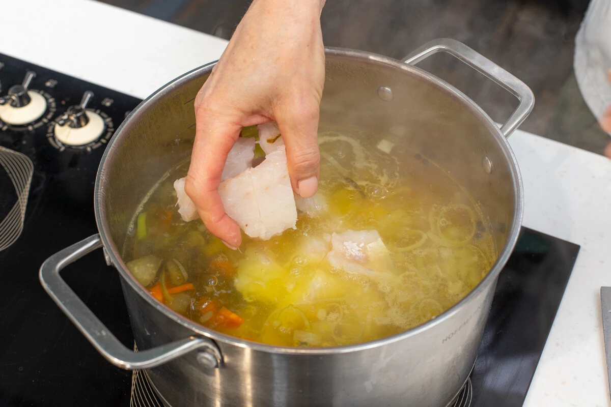 Наш рецепт — по Вильяму Похлёбкину. Он немного странный на современный взгляд: сначала делается овощной бульон без зажарки, а потом в бульоне без процеживания отваривается рыба. Технологичнее было бы сварить рыбный бульон, в нем отварить картофель, добавить овощи, огурцы, икру и кнели. Но мы решили попробовать следовать книге.