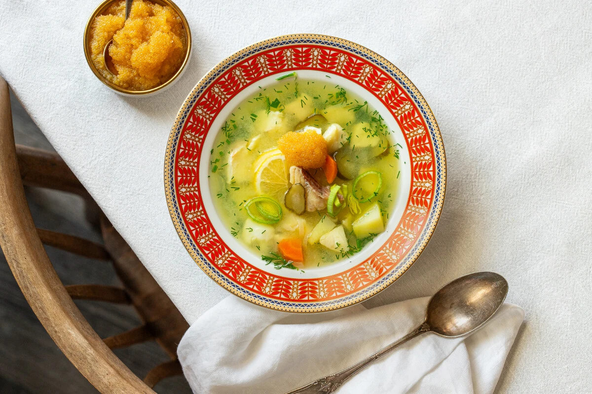 В готовый суп добавьте мелко нарезанную зелень и, по желанию, сок лимона. Дайте супу настояться. Перед подачей добавьте в тарелку мелкую икру – у нас щучья, но вы можете использовать и другую – например, икру сазана. Перед тем как есть суп, размешайте икру. Также можете подать к супу рюмки с рассолом, чтобы каждый добавлял себе по вкусу. Этот список продуктов приведен в книге Похлебкина, в нём очень велика доля рыбы. Пропорции можно изменить на свой вкус