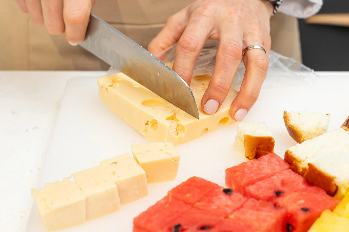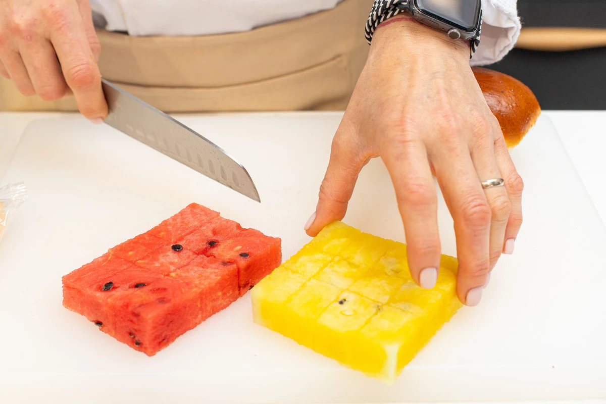 Арбуз нарежьте ломтиками толщиной примерно 2 см. Обрежьте корочки с четырёх сторон, чтобы получились квадраты. Каждый квадрат нарежьте кубиками 2 х 2 см.