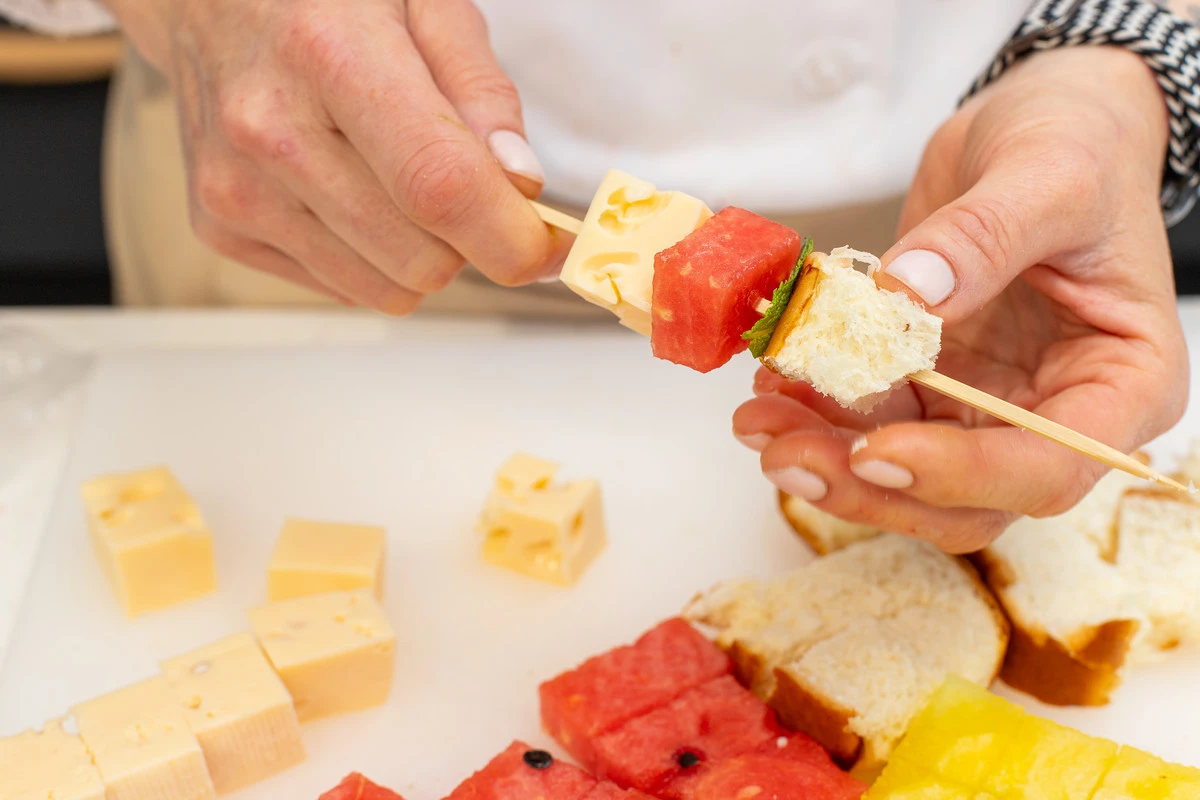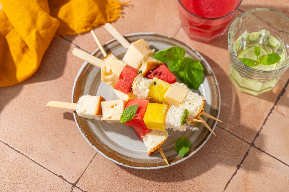 На каждую шпажку нанижите в произвольном порядке разноцветные кубики арбуза, булочки и сыра, добавьте листики мяты.