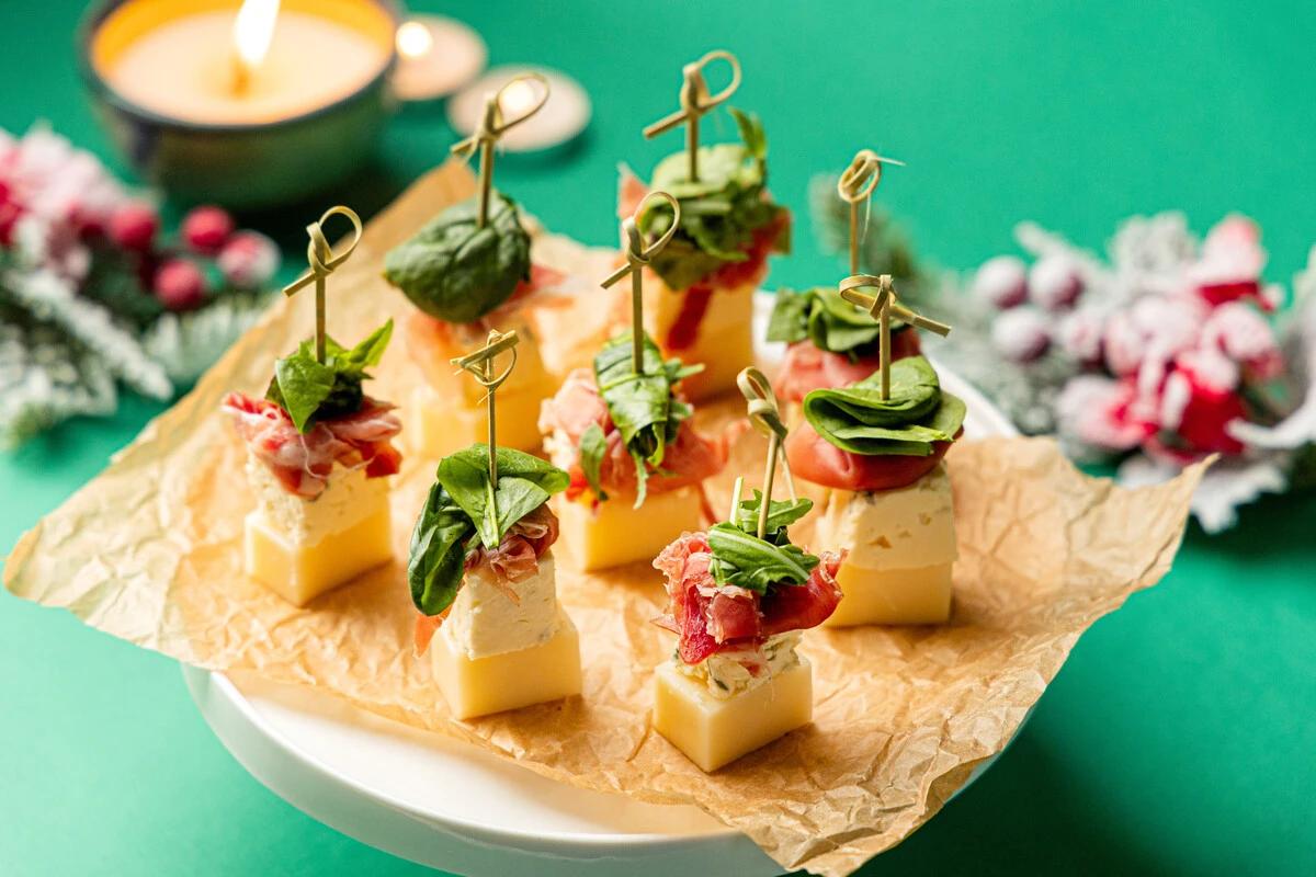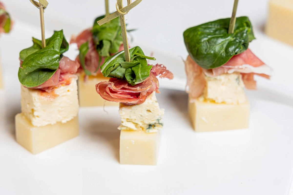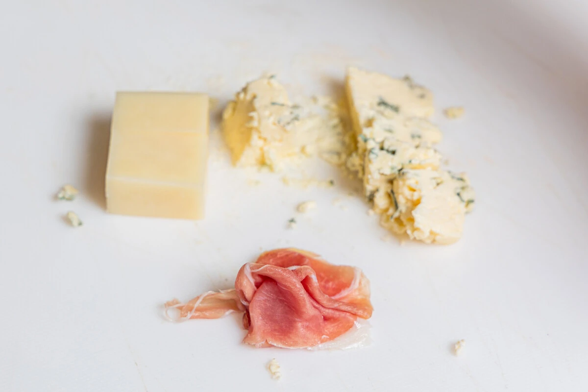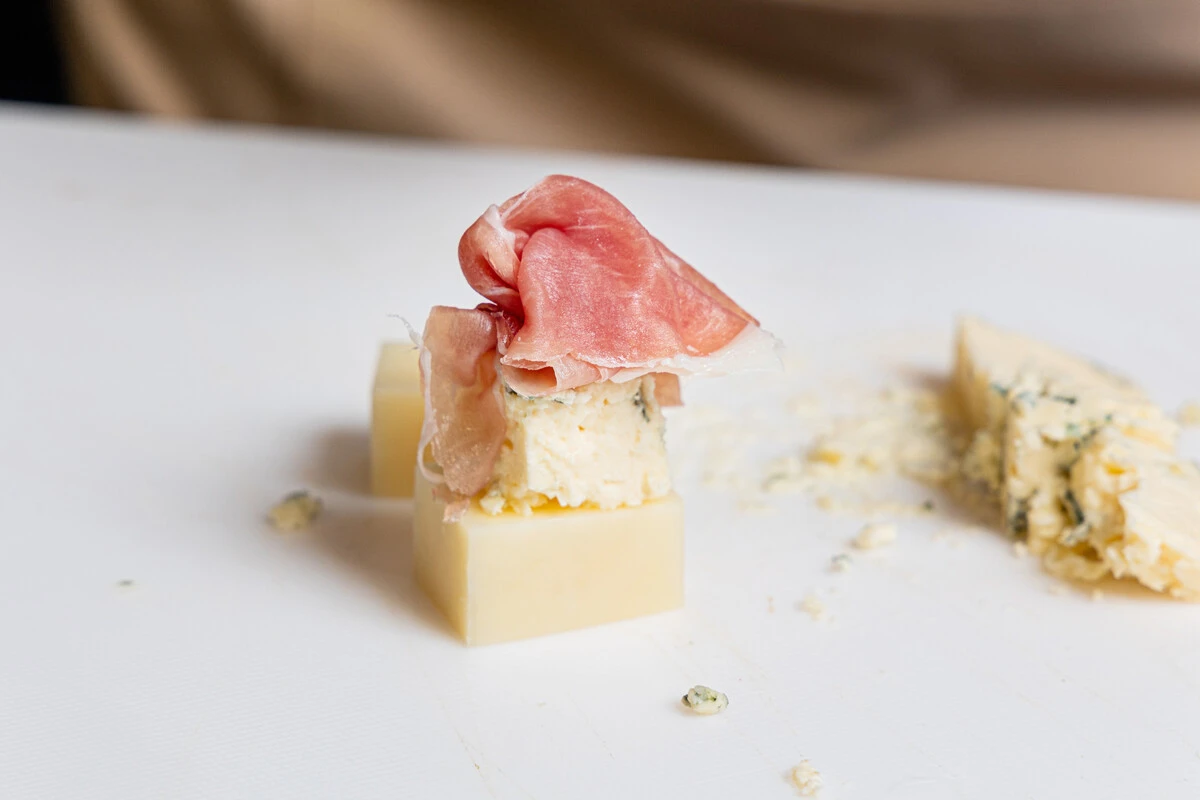 Постройте «башенку»: кубик чеддера, кубик дор блю, свернутый кусочек прошутто.