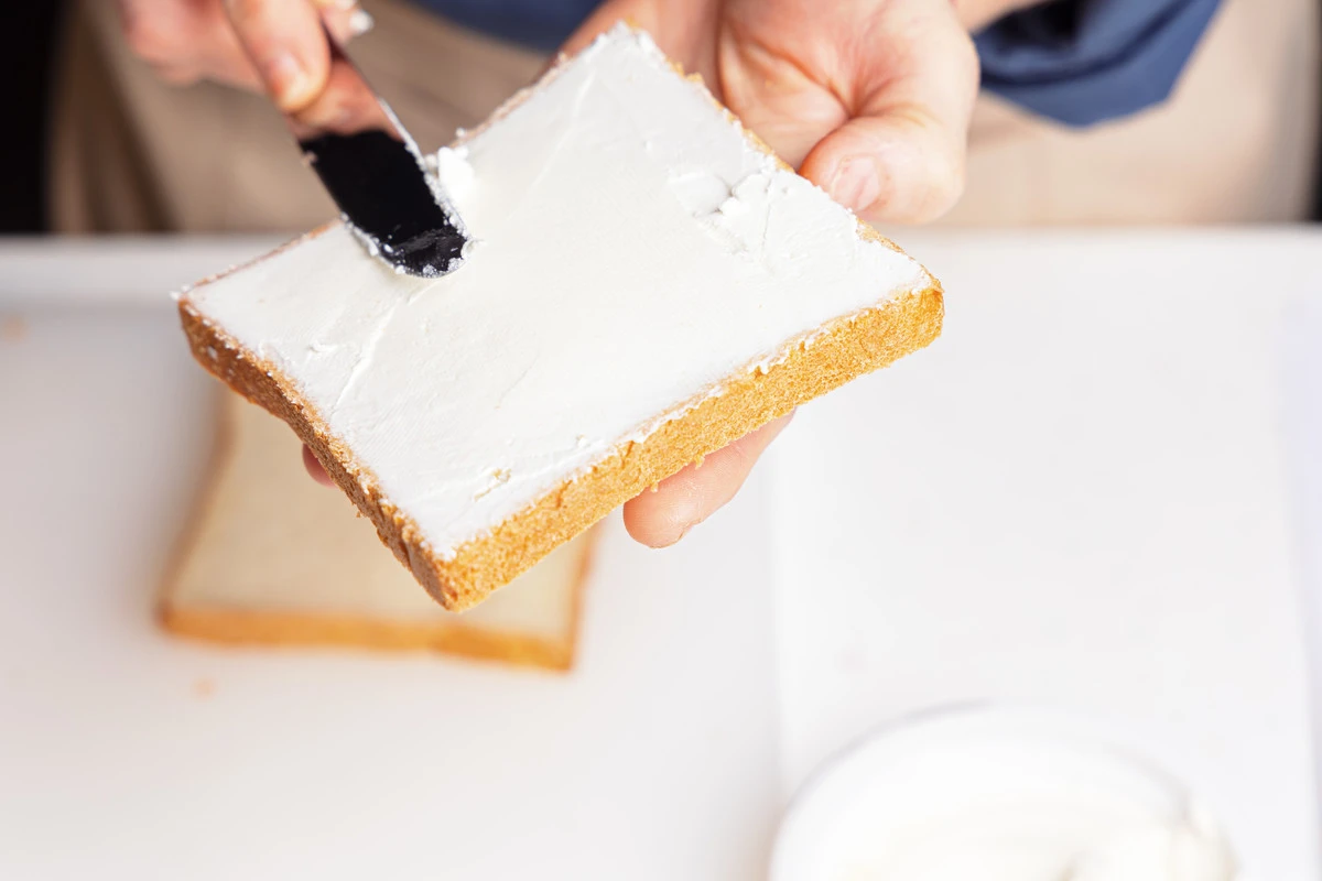 Смажьте каждый ломтик бриоши сливочным сыром.