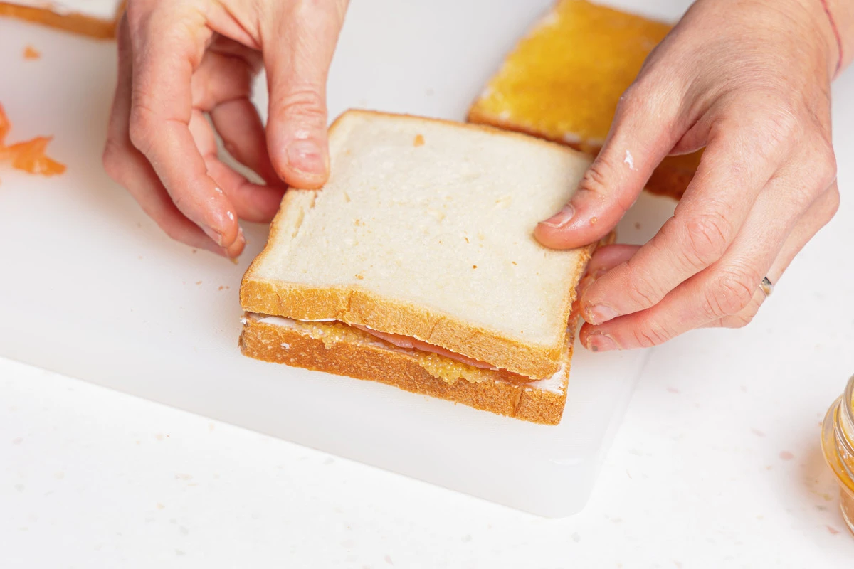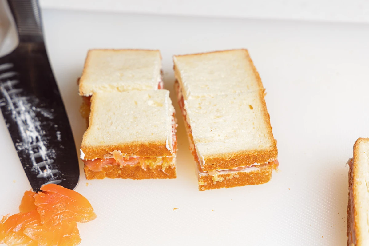 Накройте подготовленные бутерброды оставшимися ломтиками бриоши со сливочным сыром. Всего у вас получится 3 сэндвича.
