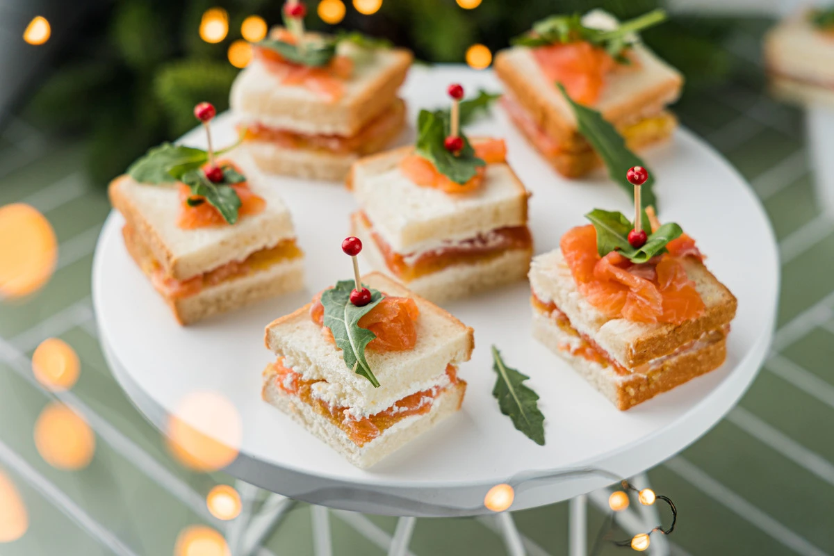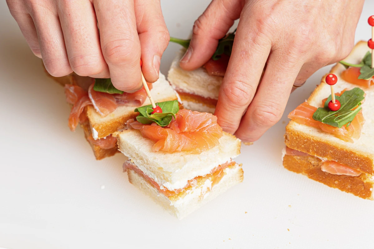 Украсьте ломтиком сёмги, листочком руколы, закрепите шпажками, воткнув их в каждый мини-сэндвич.