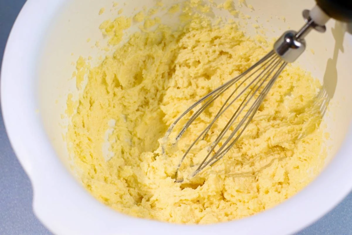 Взбейте размягчённое сливочное масло с сахаром до пышности и посветления.