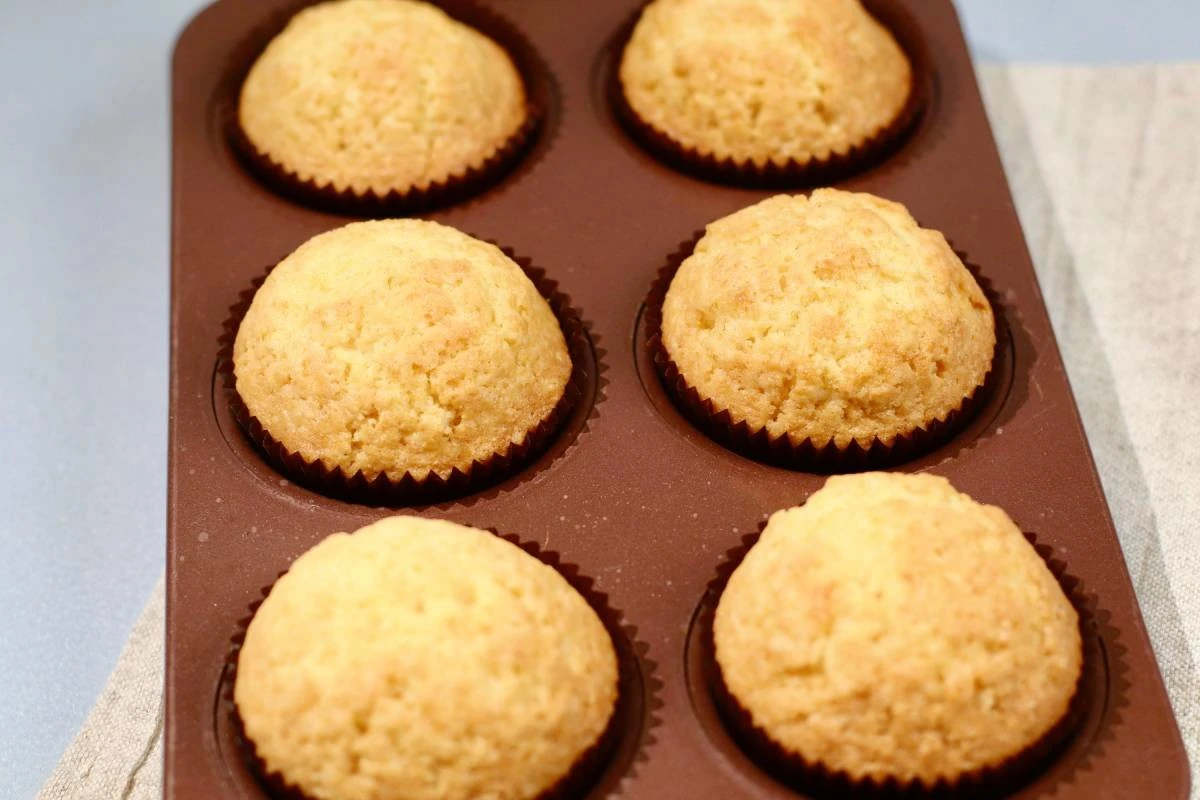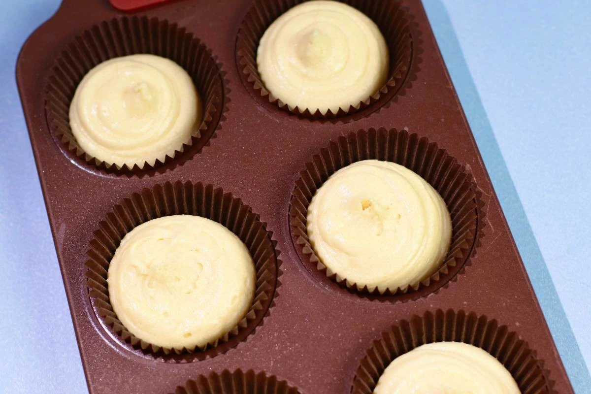 В форму для кексов добавьте бумажные формочки для выпечки. Наполните тестом на ⅔.