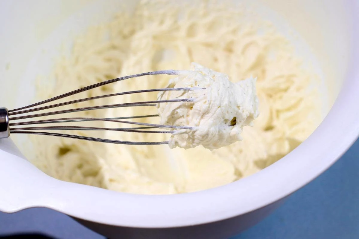 Для крема взбейте сыр, сливки, сахарную пудру и ваниль в течение 3-4 минут до пышности.