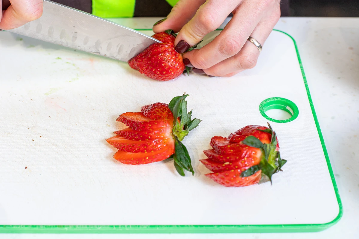 Клубнику помойте, обсушите и нарежьте тонкими ломтиками, добавьте щепотку сахарной пудры. Несколько ягод можно красиво раскрыть веером: не удаляйте хвостики и сделайте продольные разрезы, не прорезая ягоду до конца.