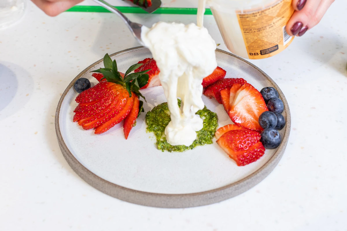 В красивую тарелку выложите песто по центру, добавьте ягоды клубники и голубики. Сверху на песто выложите страчателлу.