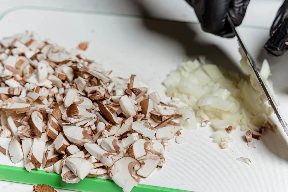 Лук очистите и нарежьте мелкими кубиками. Грибы протрите салфеткой и тоже нарежьте мелкими кубиками.