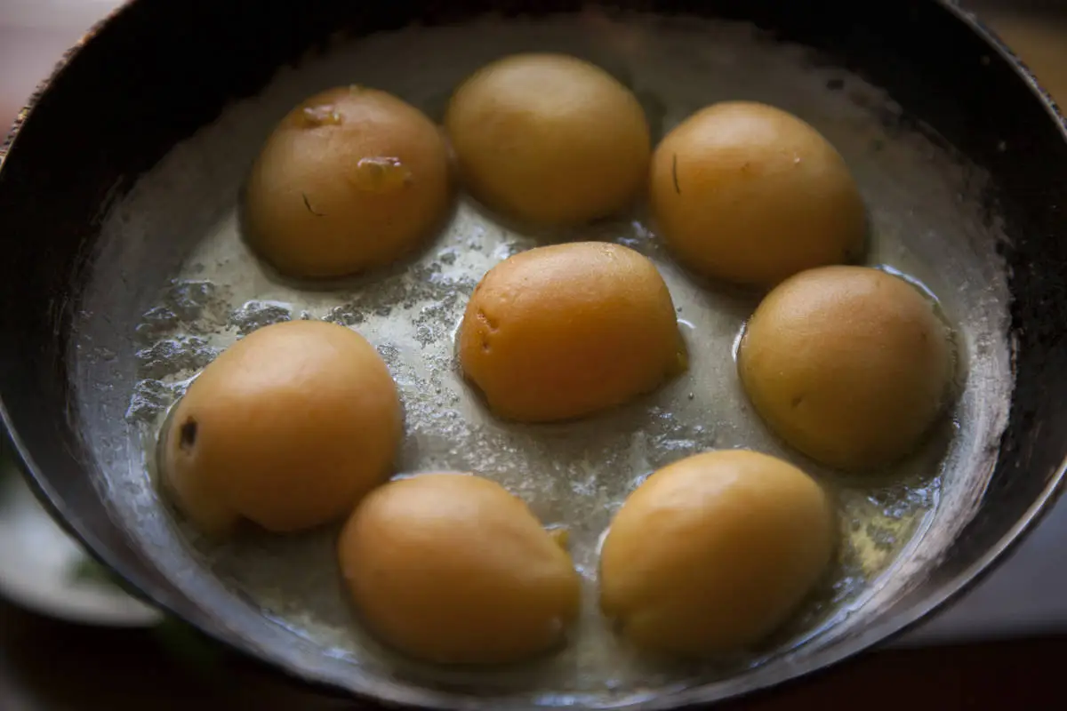 Растопите в сковороде сливочное масло с сахаром, положите половинки фруктов срезом вниз и поджарьте около минуты. Следите, чтобы карамель не переготовилась, иначе будет горько.