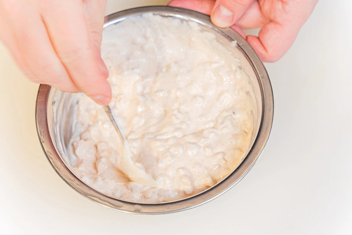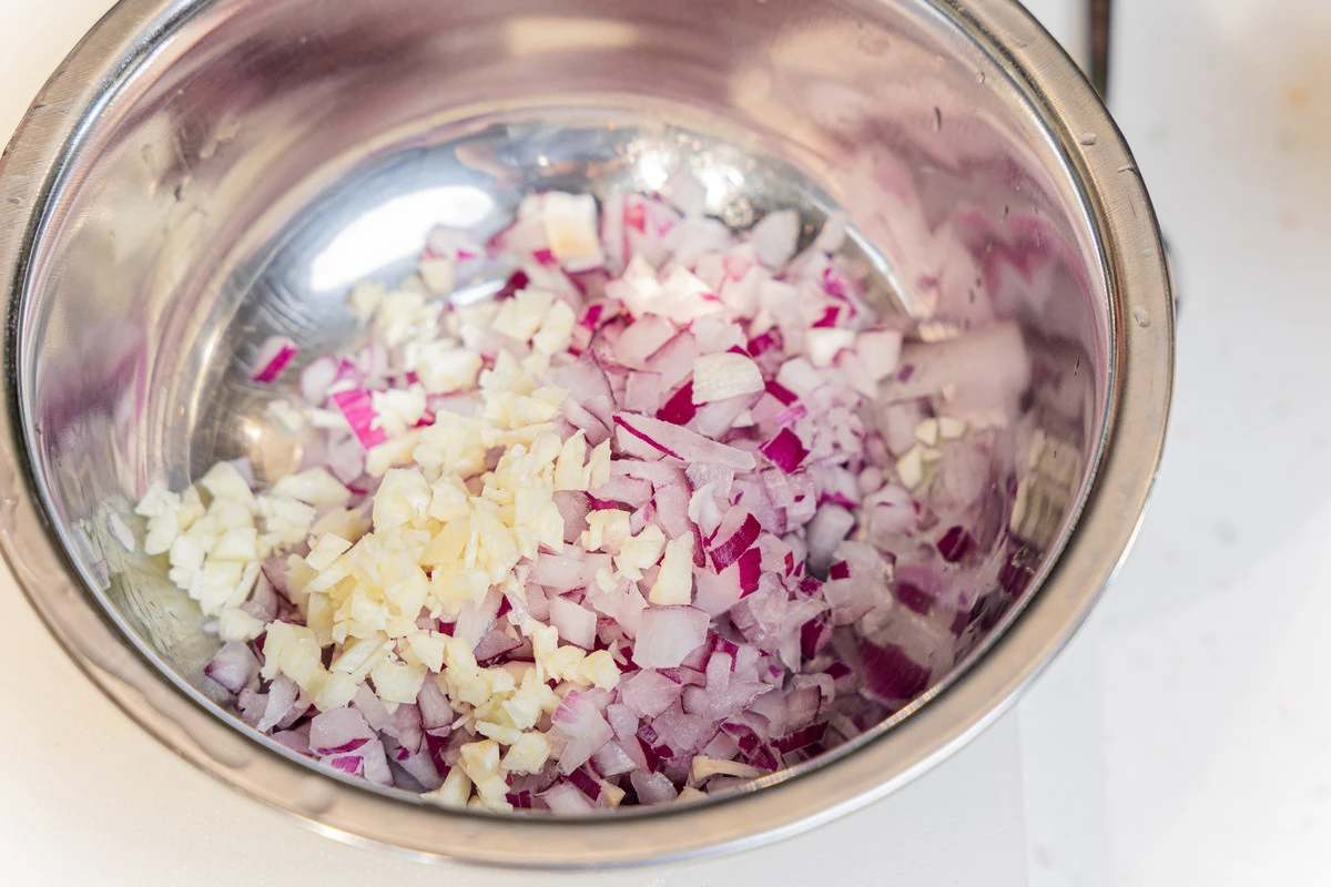 Сделайте сметанный соус. Нарежьте мелко красный лук и 2 зубчика чеснока, сложите в миску.