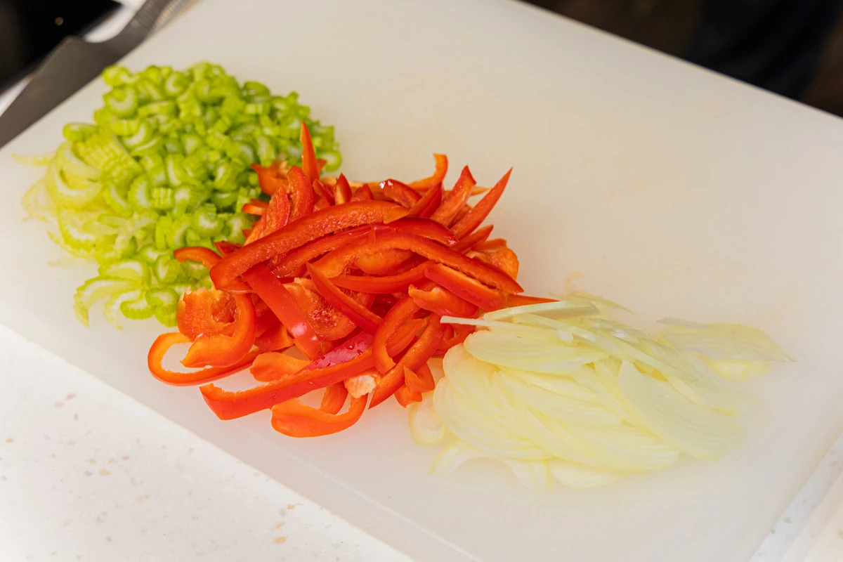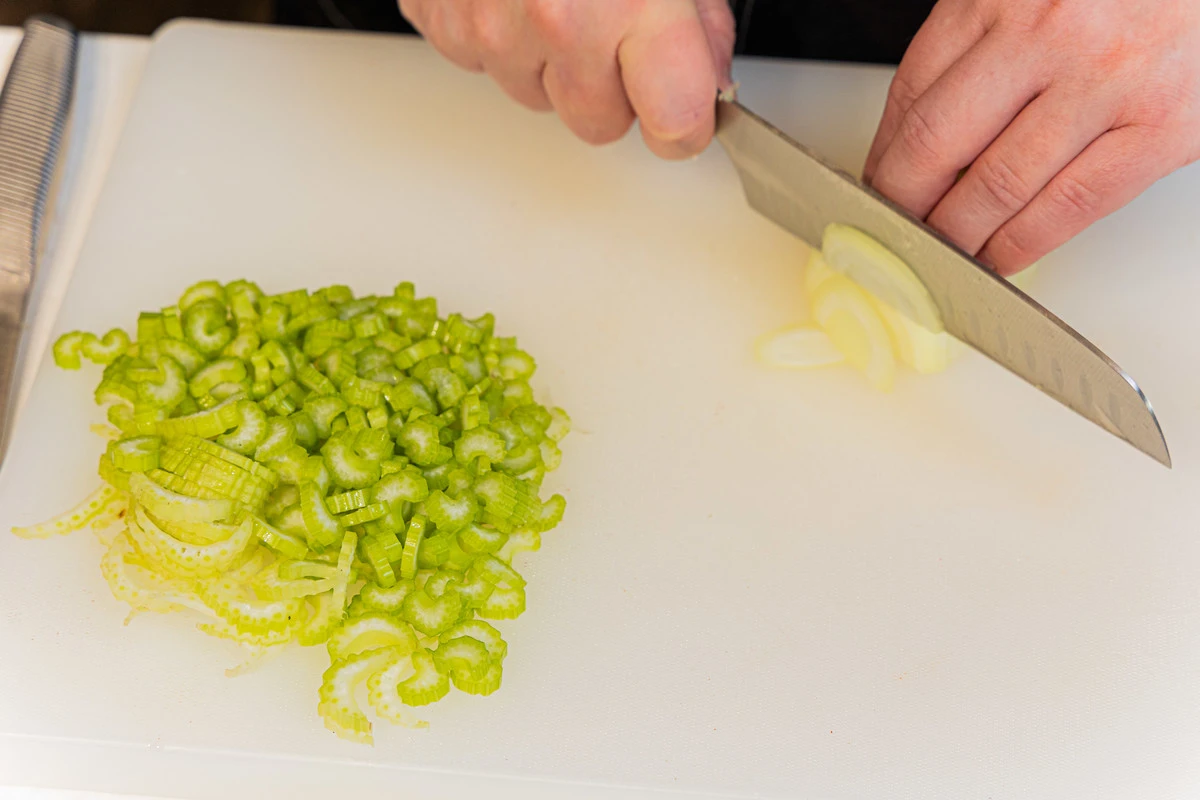 Сельдерей нарежьте ломтиками, репчатый лук — полукольцами.