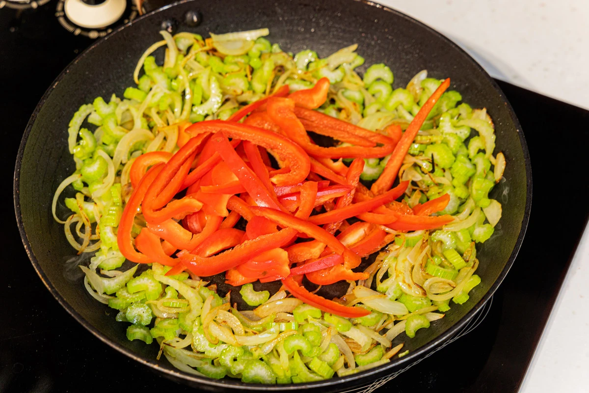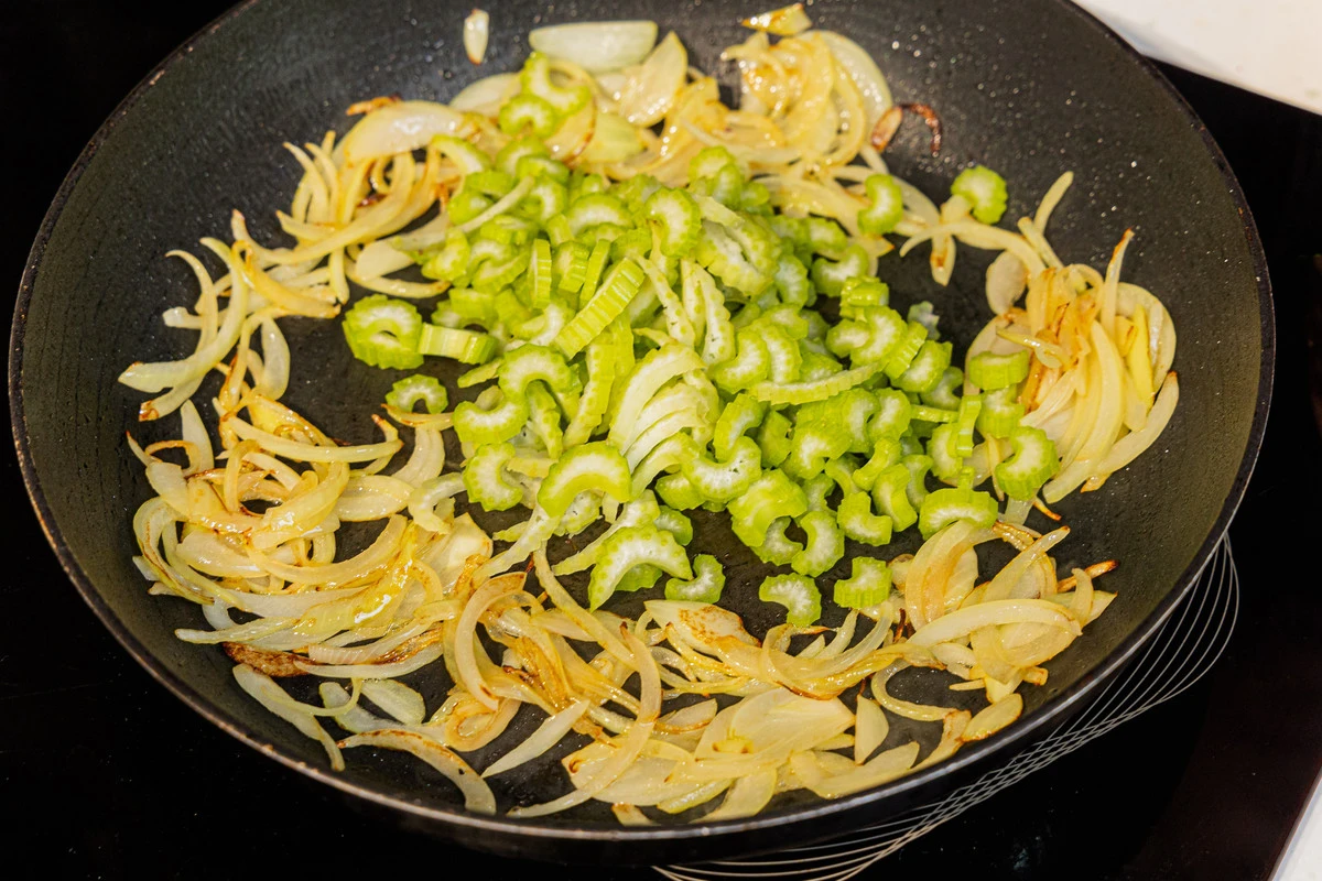 Добавьте сельдерей и готовьте ещё 3-5 минут.