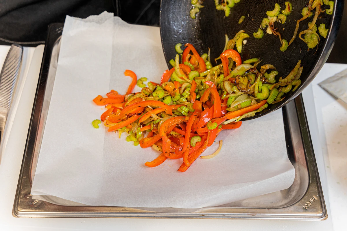 Застелите противень пергаментом. Выложите на него обжаренные овощи.
