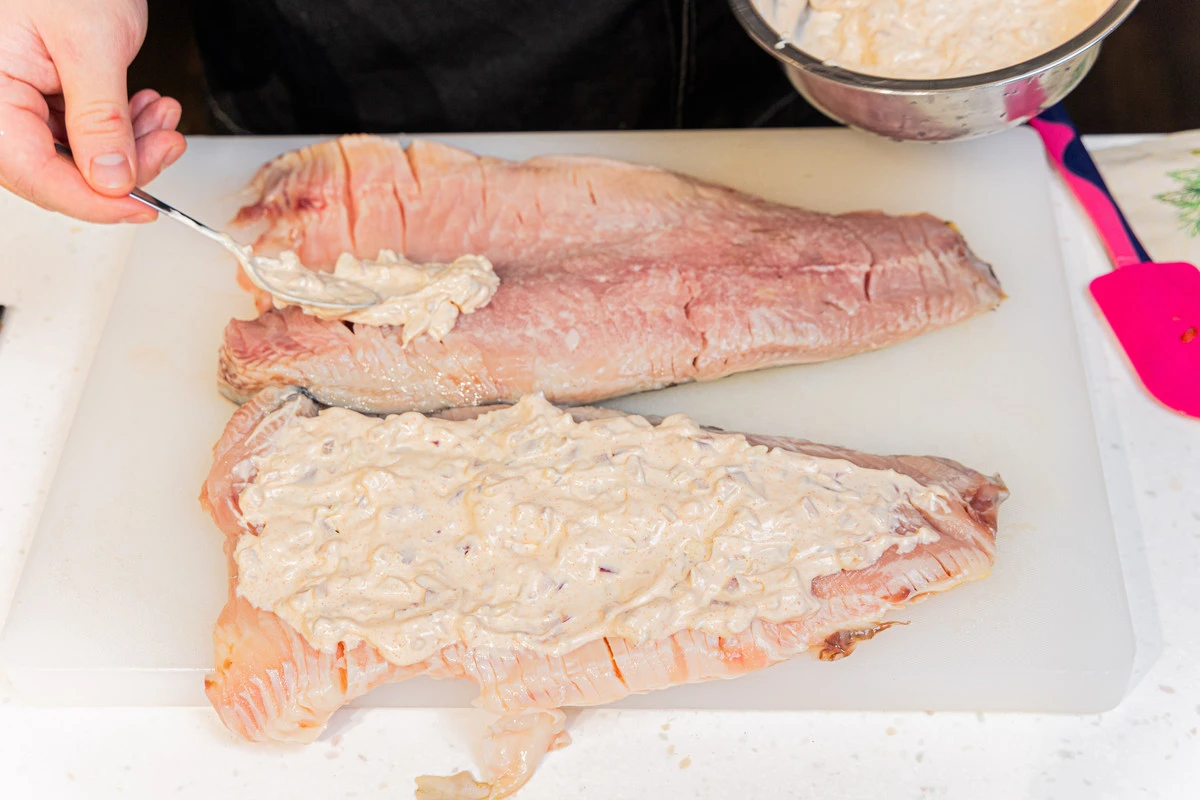 Сверху поместите предварительно размороженного карпа кожей вниз. На филе выложите сметанный соус, равномерно распределите.