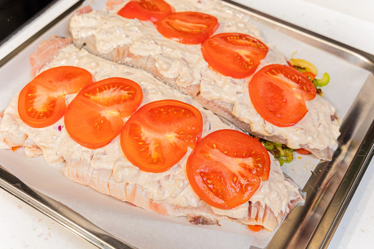 Помидор нарежьте кружочками и выложите на рыбу. Запекайте карпа в духовке в течение 25 минут при 190 °C.