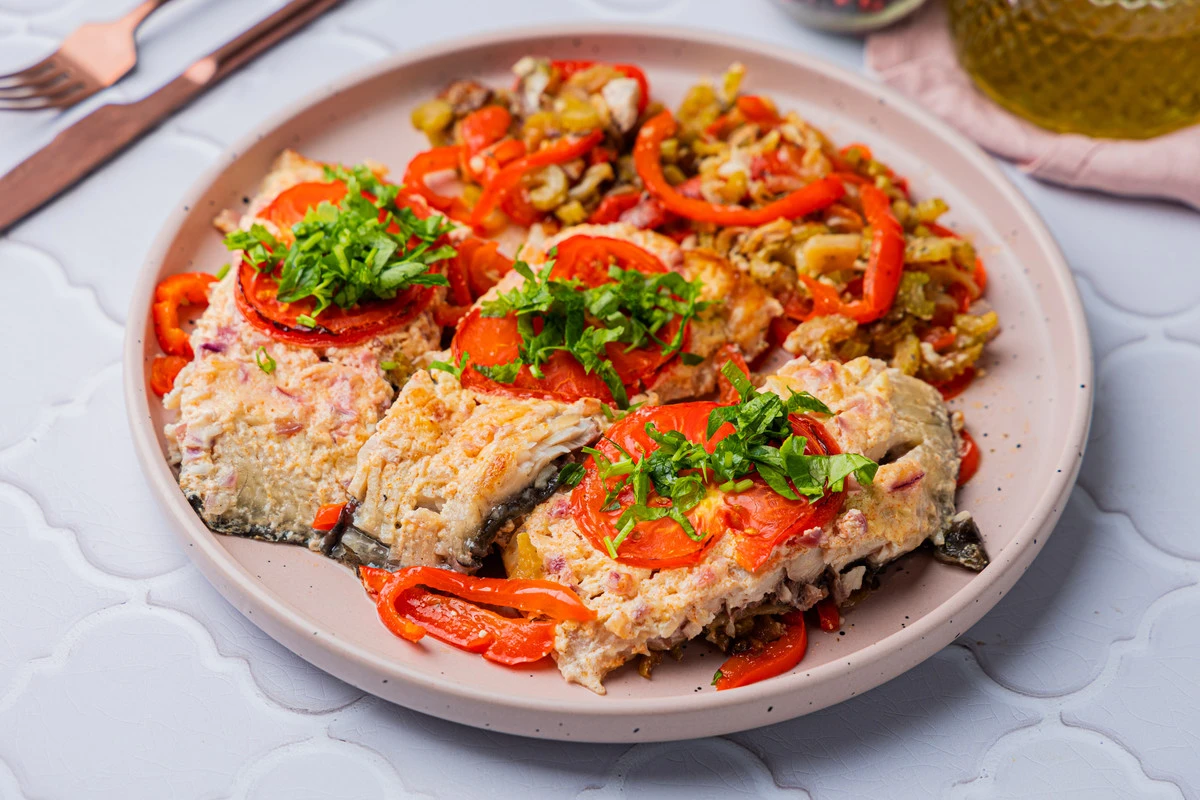 В рецепте используются товары из категорий: Рыба, икра и морепродукты; Овощи, фрукты, ягоды, зелень; Масла, соусы, специи, сахар и соль; Молочные продукты, яйцо