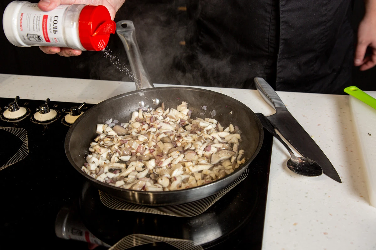 Вешенки и лук мелко порубите, а затем обжарьте на растительном масле.