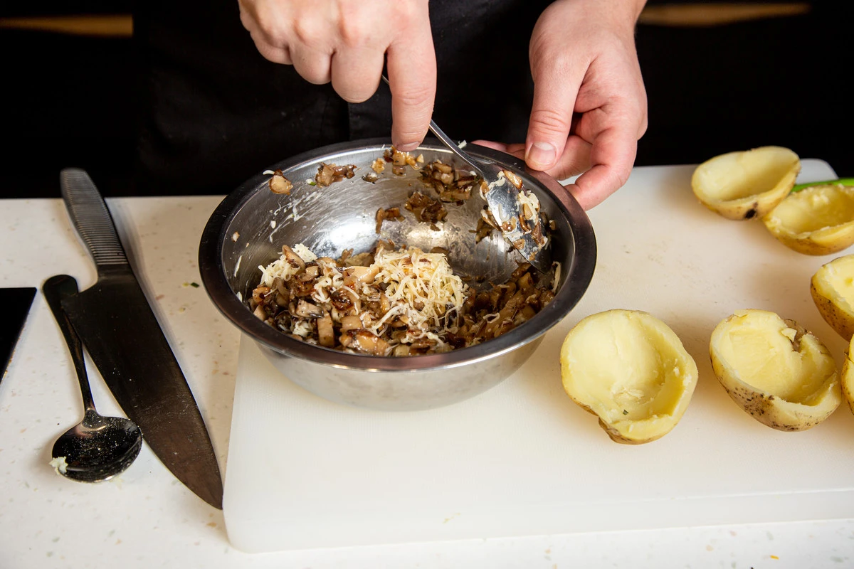 Заполните половинки картофеля смесью вешенок и сыра.