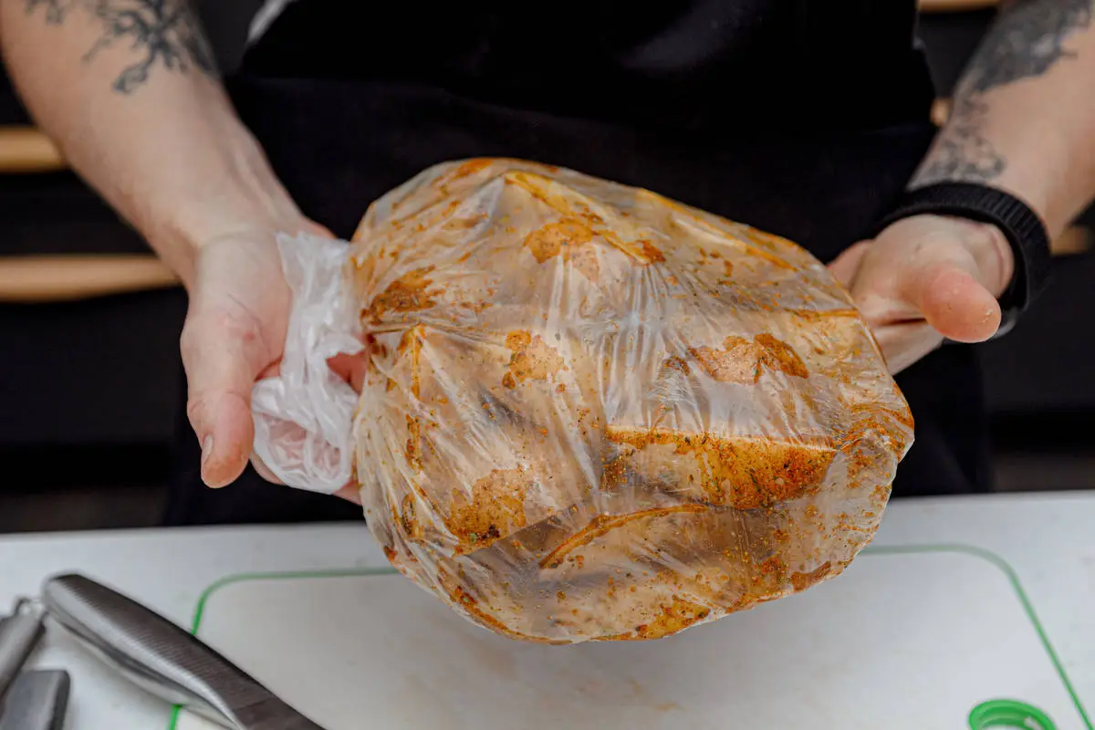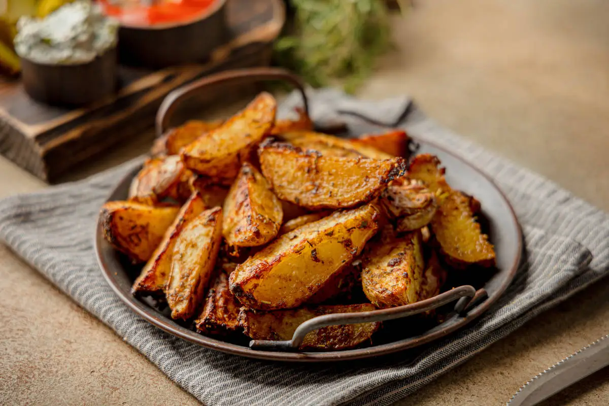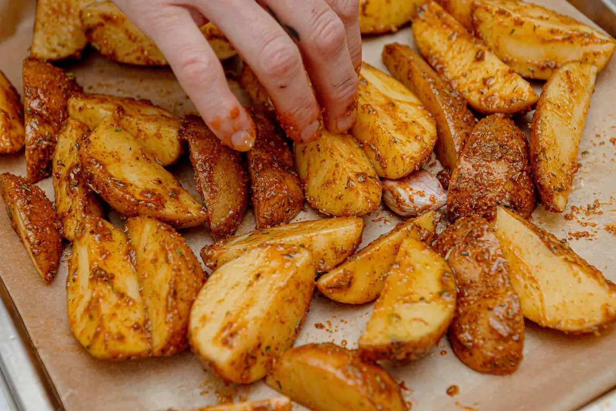 Сложите дольки в большой контейнер или пакет, добавьте оливковое масло и приправу. Закройте контейнер или пакет и тщательно встряхните, чтобы равномерно распределить специи по картошке.