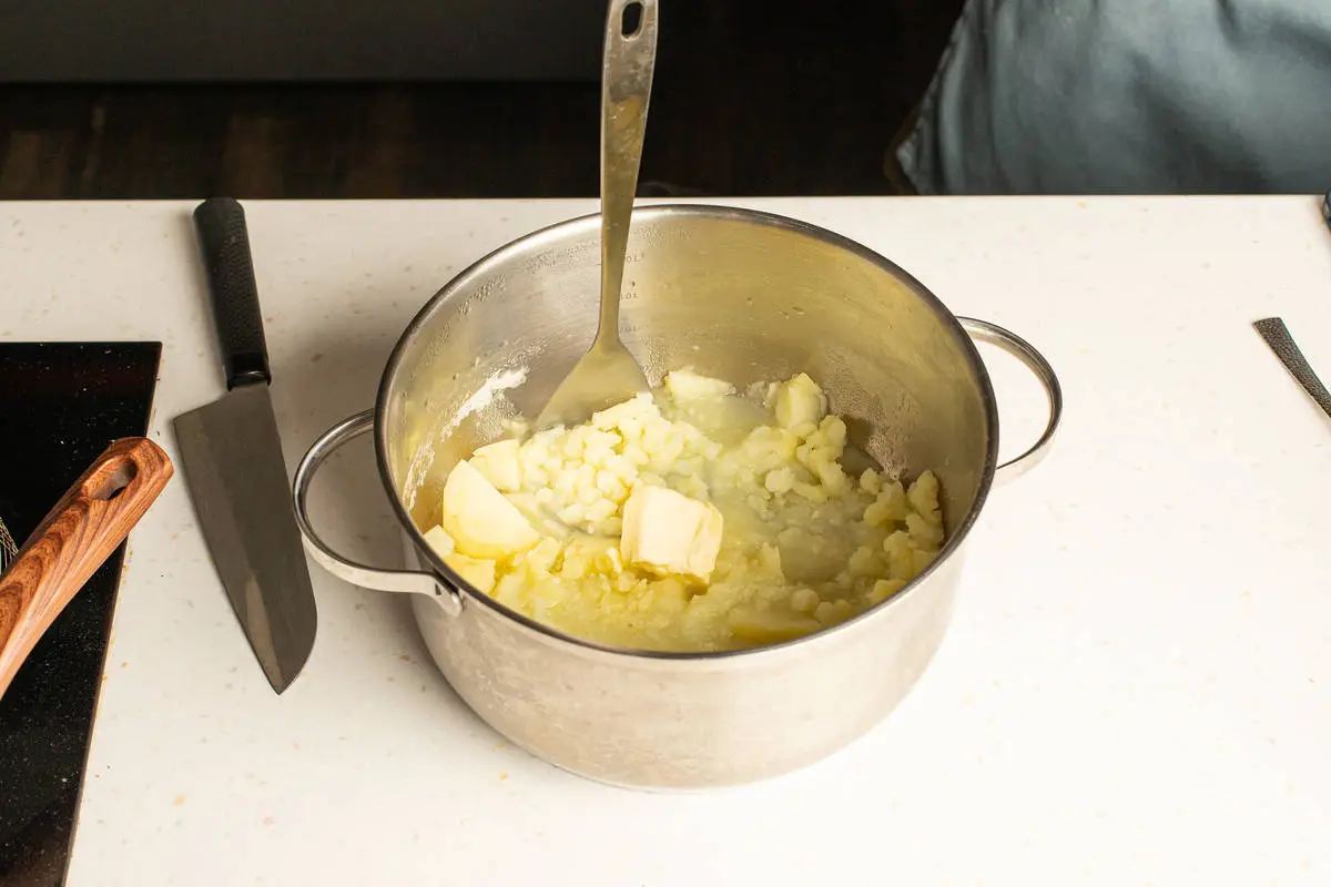 Разогрейте молоко со сливочным маслом и влейте в горячую картошку, растолките ручной толкушкой (блендер использовать не нужно). Разбейте яйцо и соль, тщательно перемешайте пюре.