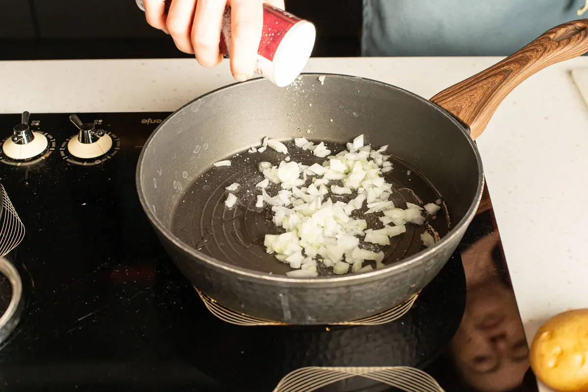 Лук почистите, нарежьте мелкими кубиками, обжарьте на растительном масле до золотистости.